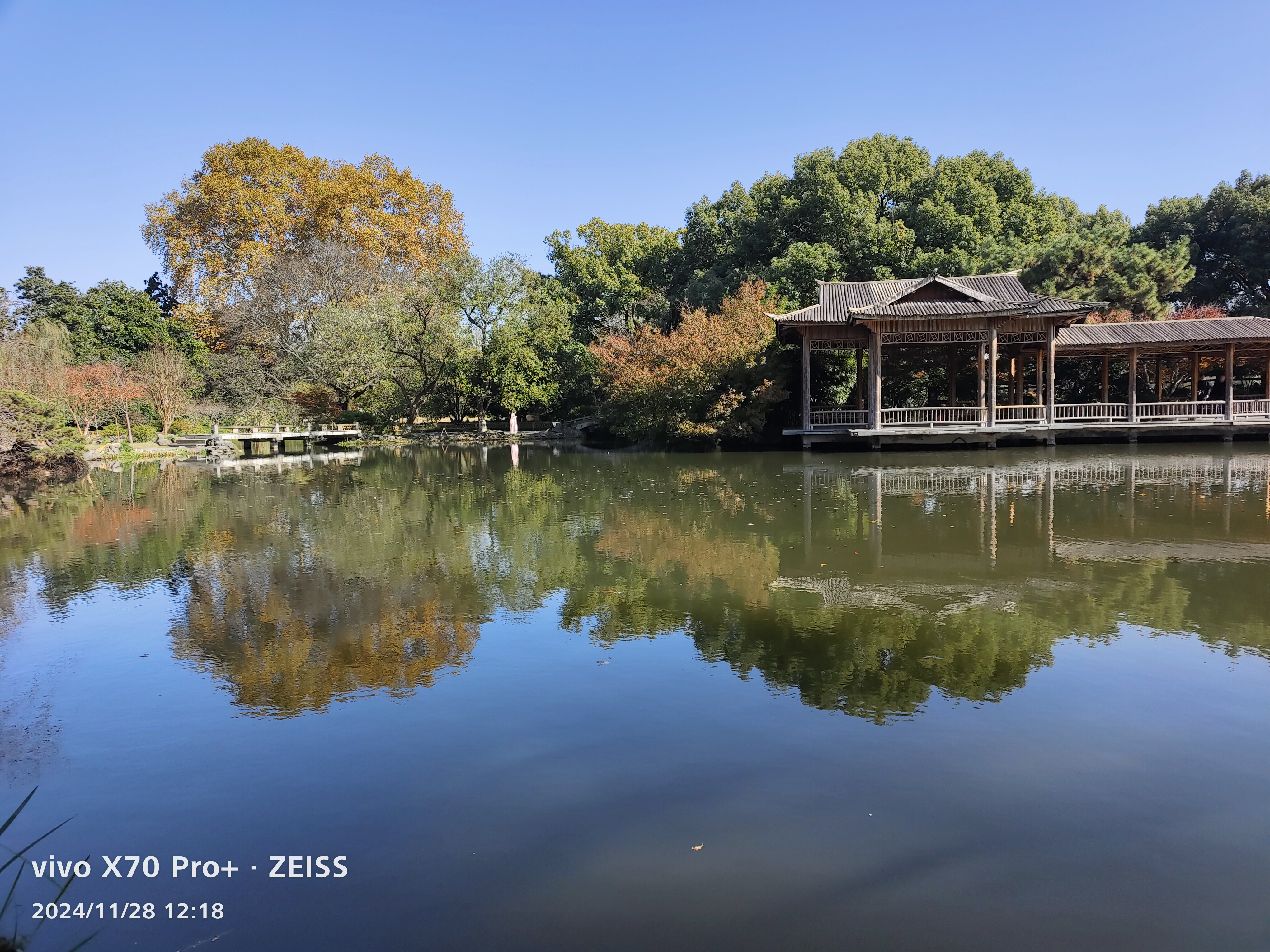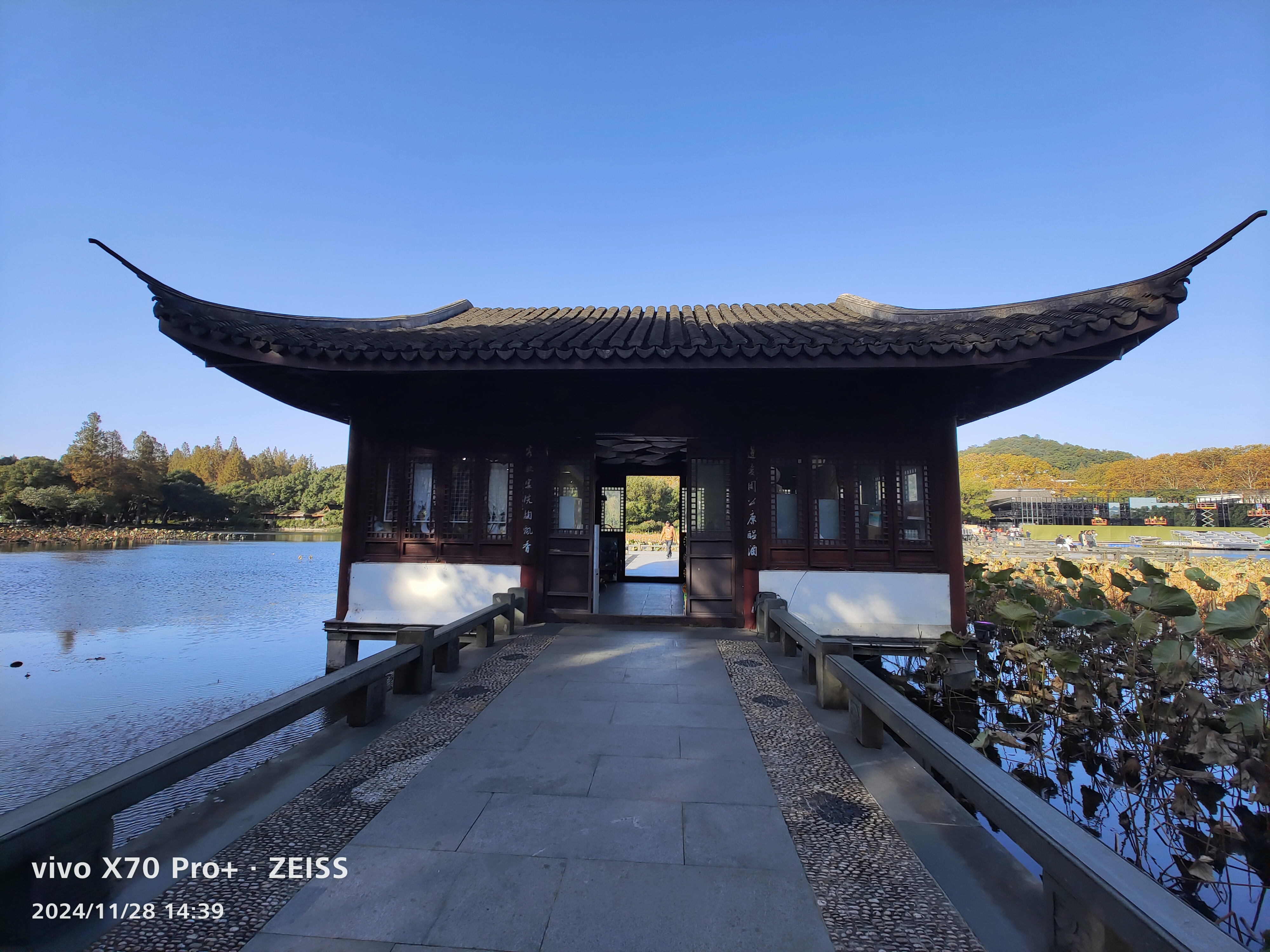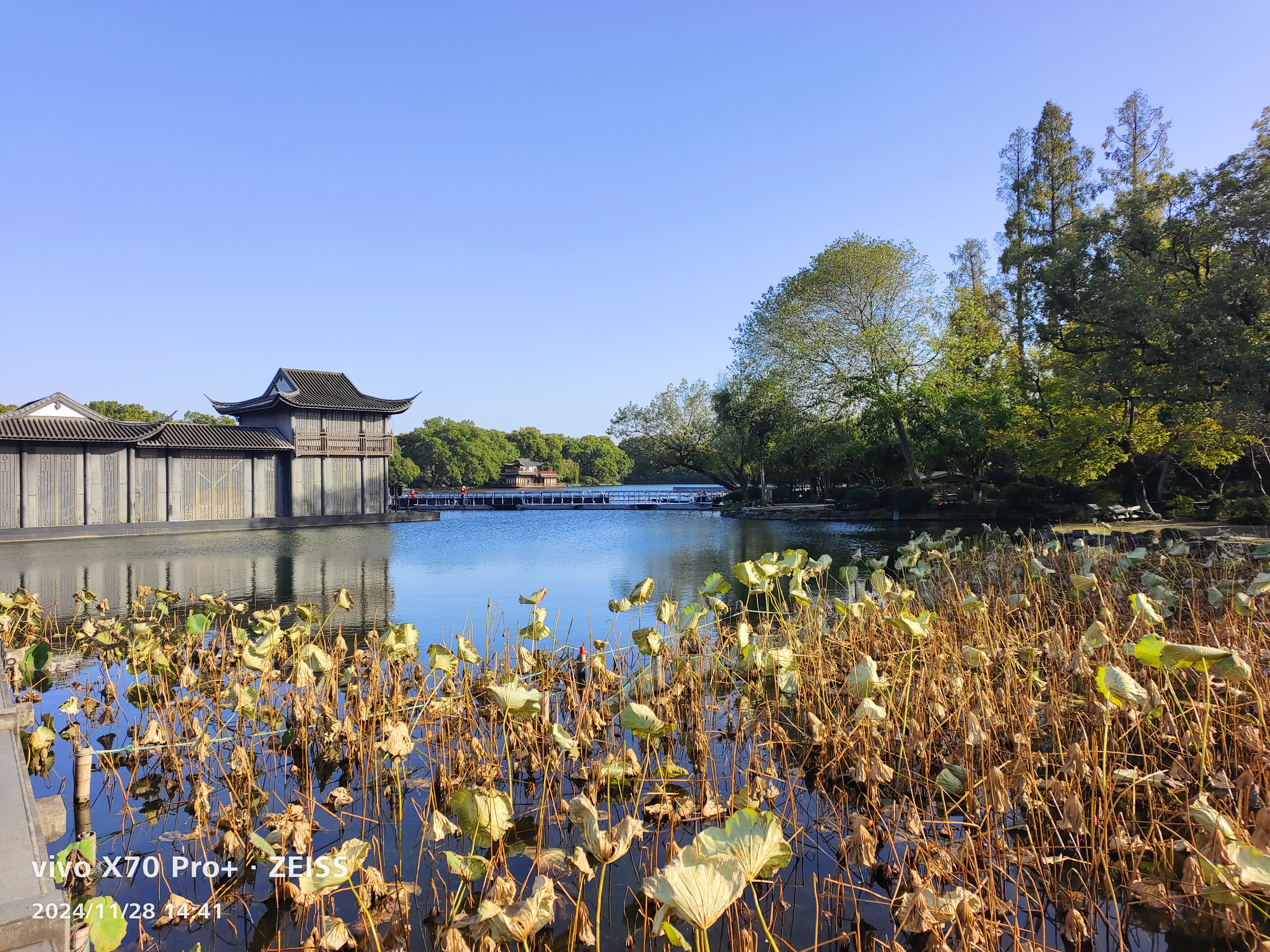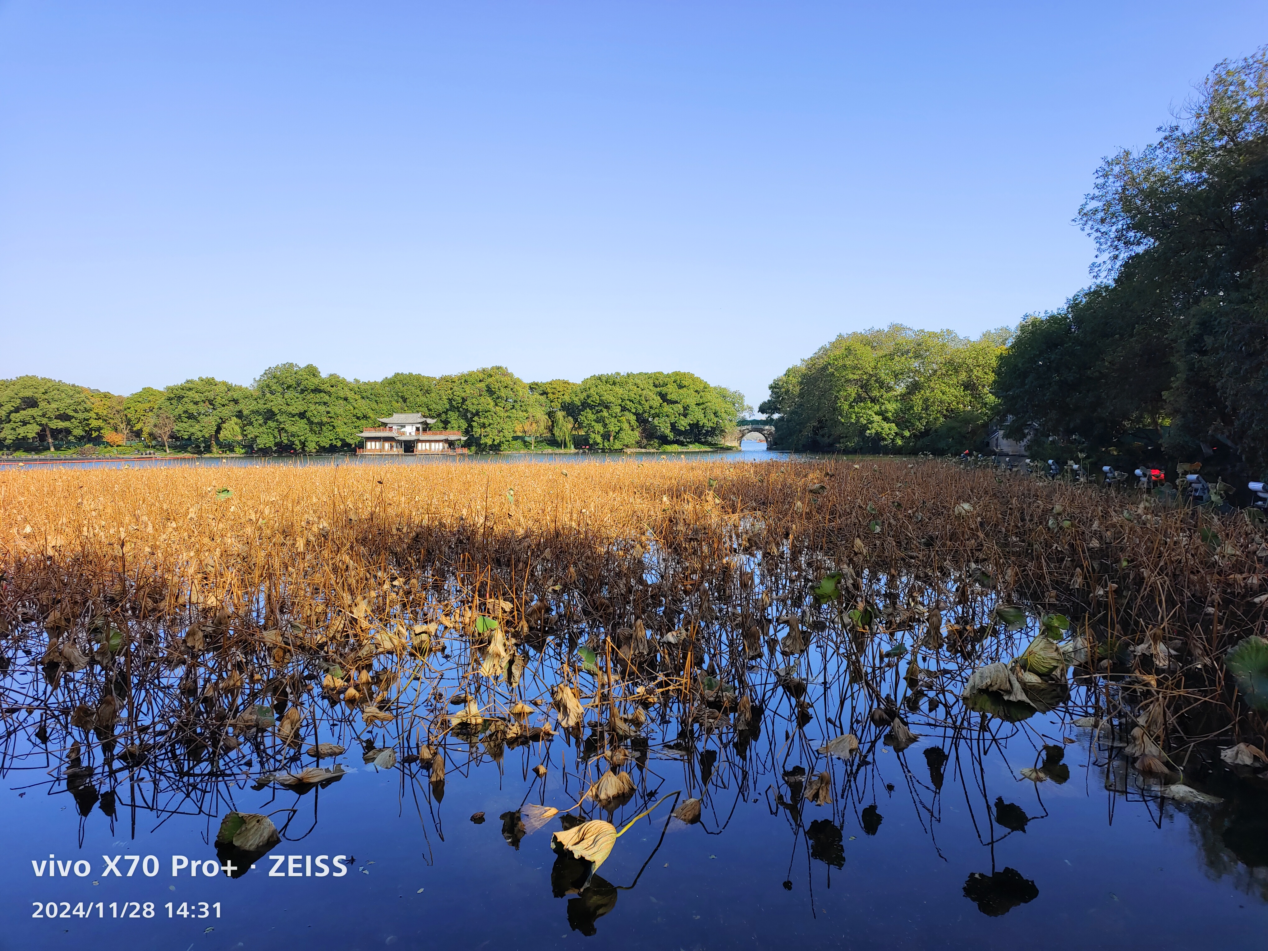 不过时至仲秋,荷已凋零,满湖枯枝败叶,一片褐黄色,也颇有秋日气息,其景也美,其色也纯。