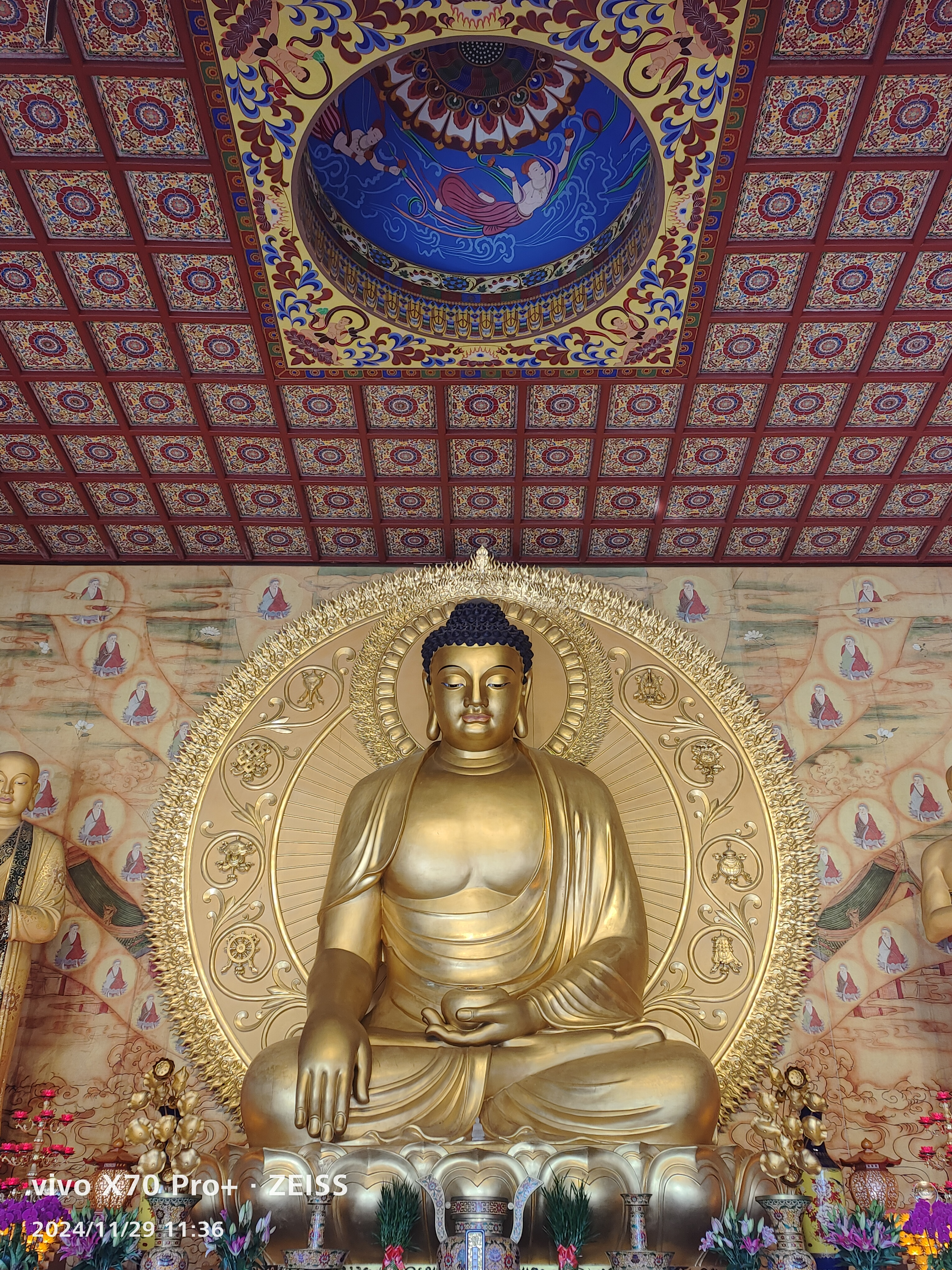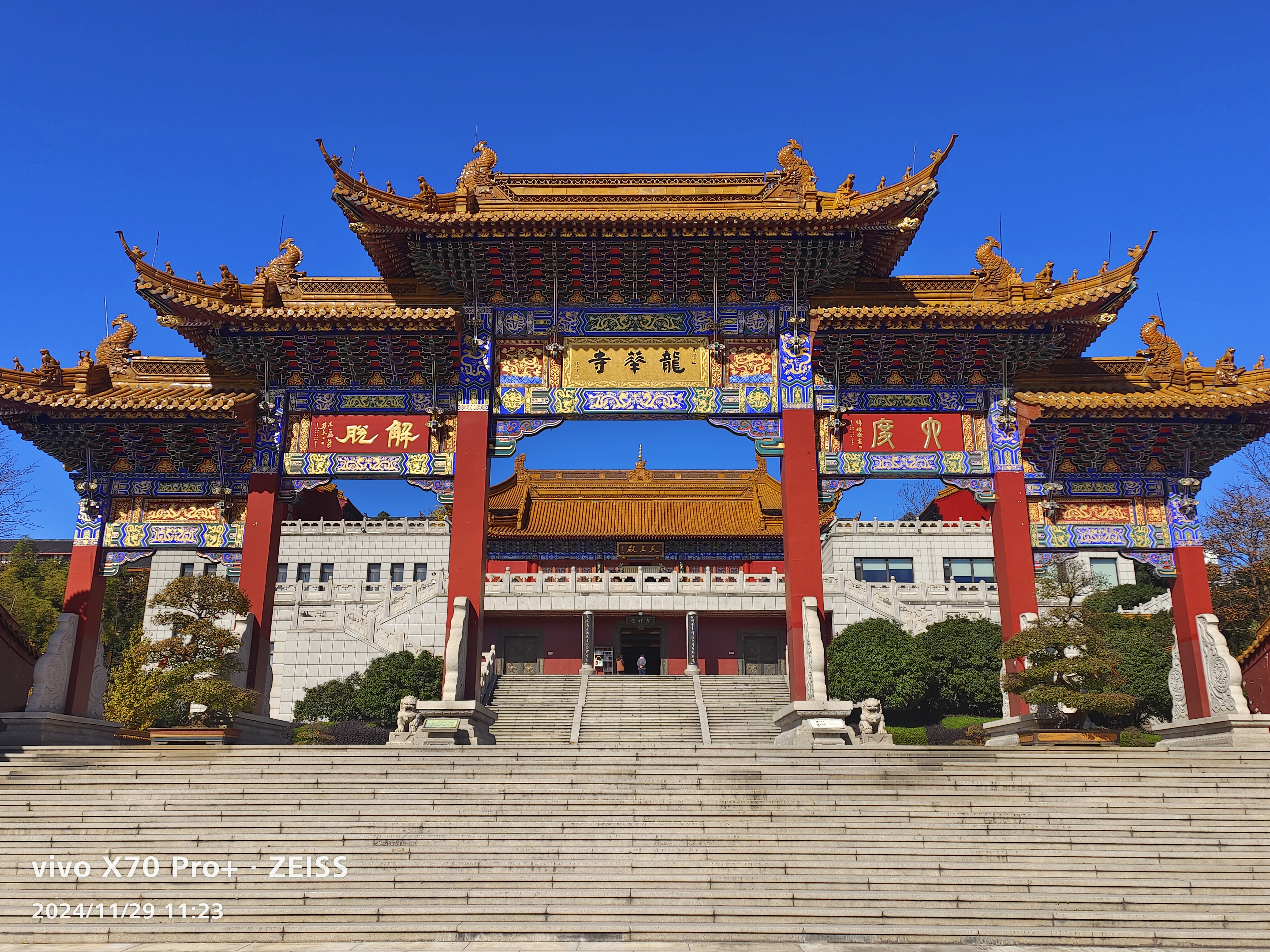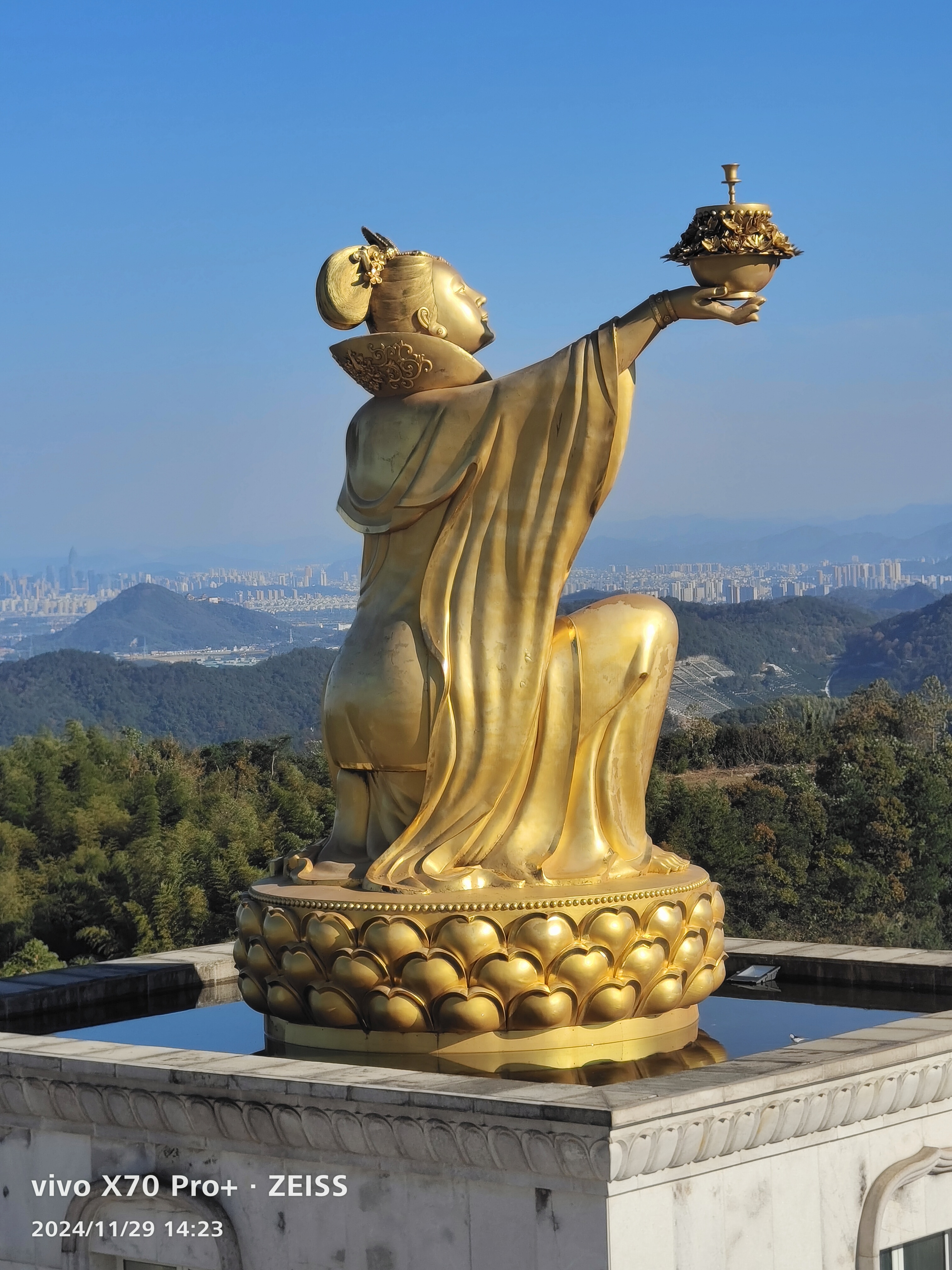 我们先到龙华寺,会稽山龙华寺建在香水海南,依山而建,将两个山头南北贯通,雕梁画栋,层层叠叠,清净庄严,气势恢宏;建筑面积达四万多平方米,是国内单体最大的皇家风格的佛教寺院。内有可同时容纳500人的禅堂及斋堂,有僧寮居士寮及上客堂等。龙华寺中轴线自北向南依次建龙华阁(内建藏经楼及法堂),供龙华树(桂花树)下弥勒成佛像及龙华三会场景露天雕像,左右建药师殿及弥陀殿,形成新的横三世佛殿;卧佛殿(内供汉白玉雕卧佛及十六住世大阿罗汉像);大雄宝殿(内供释迦佛及十大弟子及海岛观音群雕,东西配殿供四大菩萨及祖师伽蓝像);天王殿(内供接引布袋和尚像及韦陀坐姿像和四大天王像);山门(两侧供六米高石雕哼哈二将像);礼佛广场(宽56米长130米);水景照山。从照山到兜率天宫北侧北方多闻天王,形成了长达2500米的中轴线,堪称全国乃至世界之最。建筑风格融合了皇家寺院的大气恢宏和江南园林的婉约灵动,红墙、金瓦组成的礼佛殿堂群与富有江南民居风格的白墙、木柱、黛瓦组成的人居楼阁群相映成趣,移步换景,美轮美奂,彰显了二十一世纪皇家寺院的建筑典范。