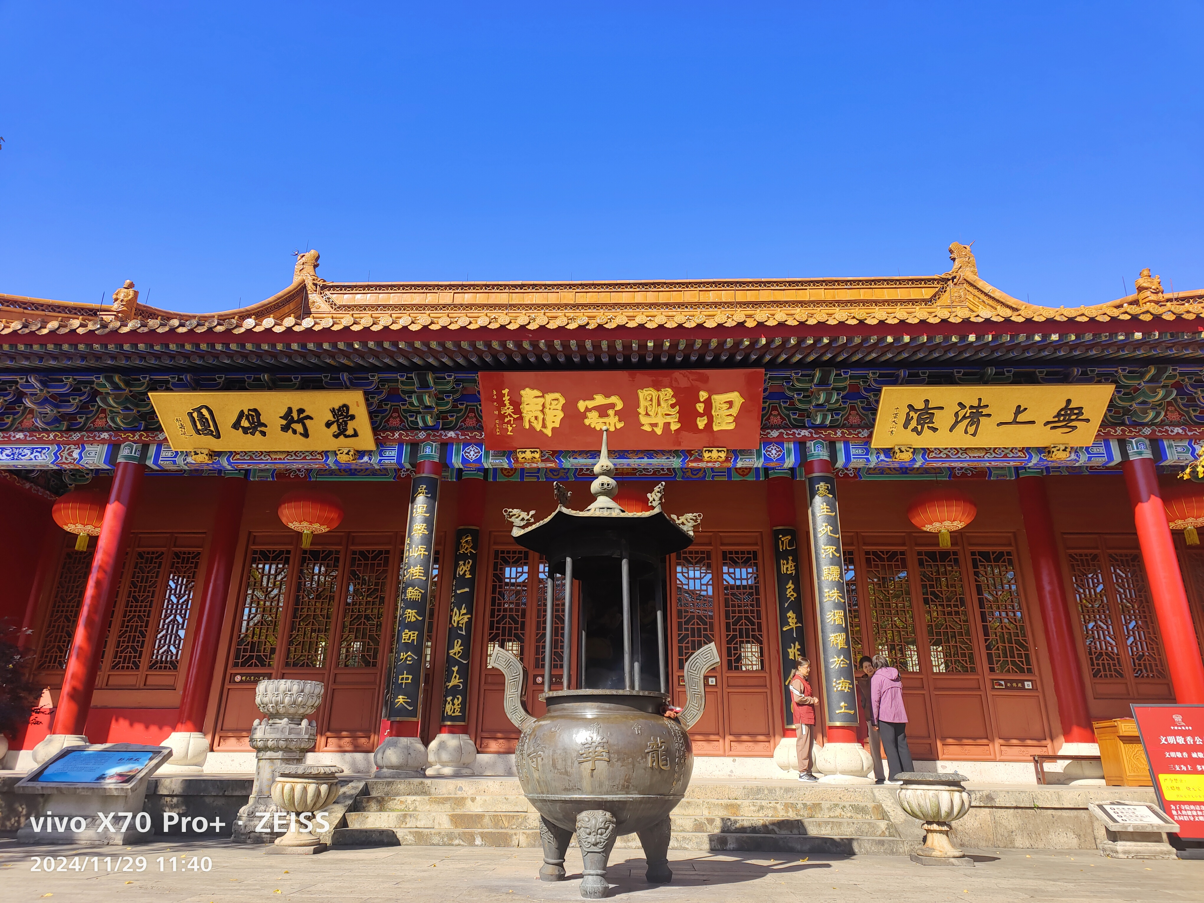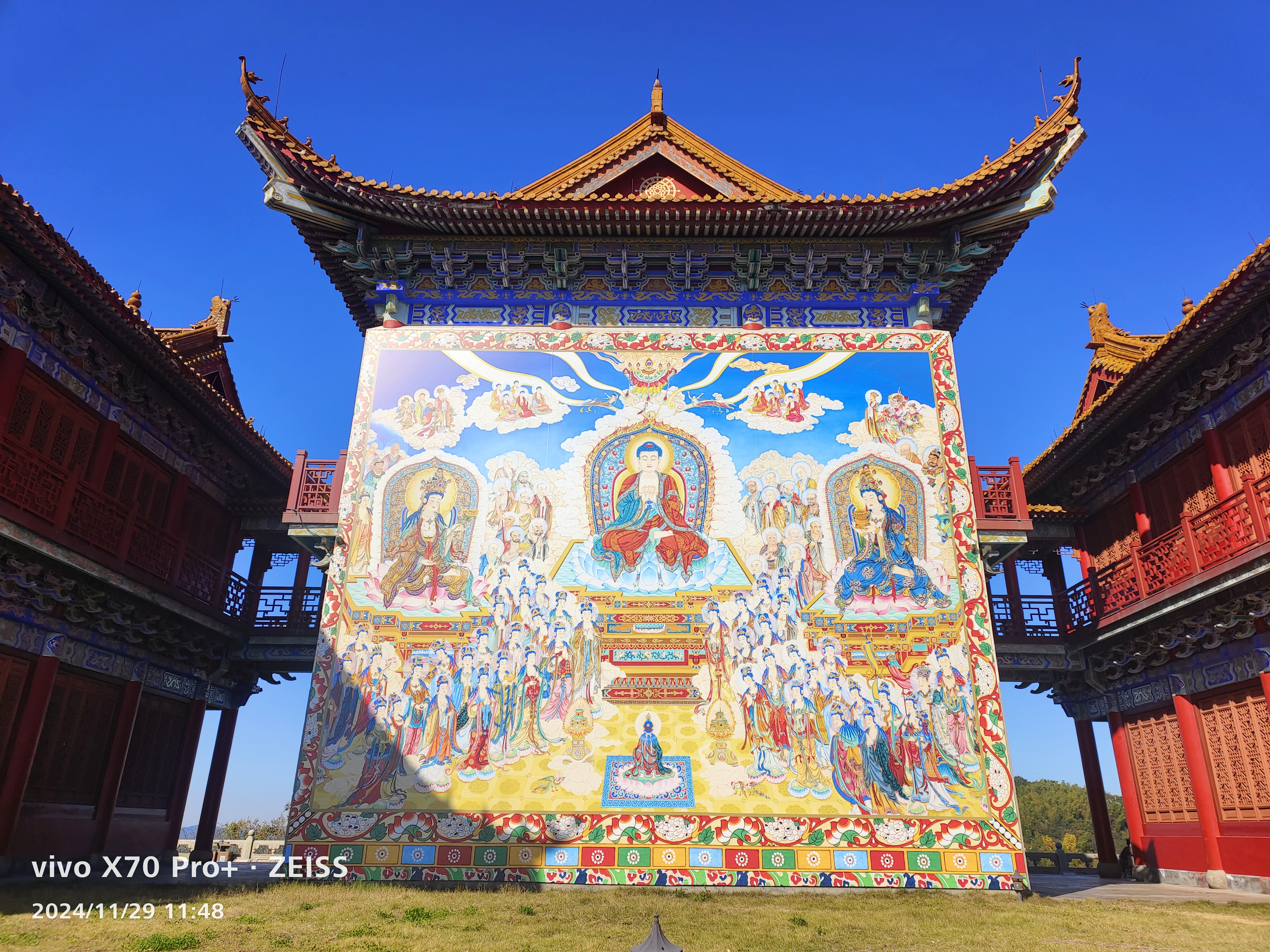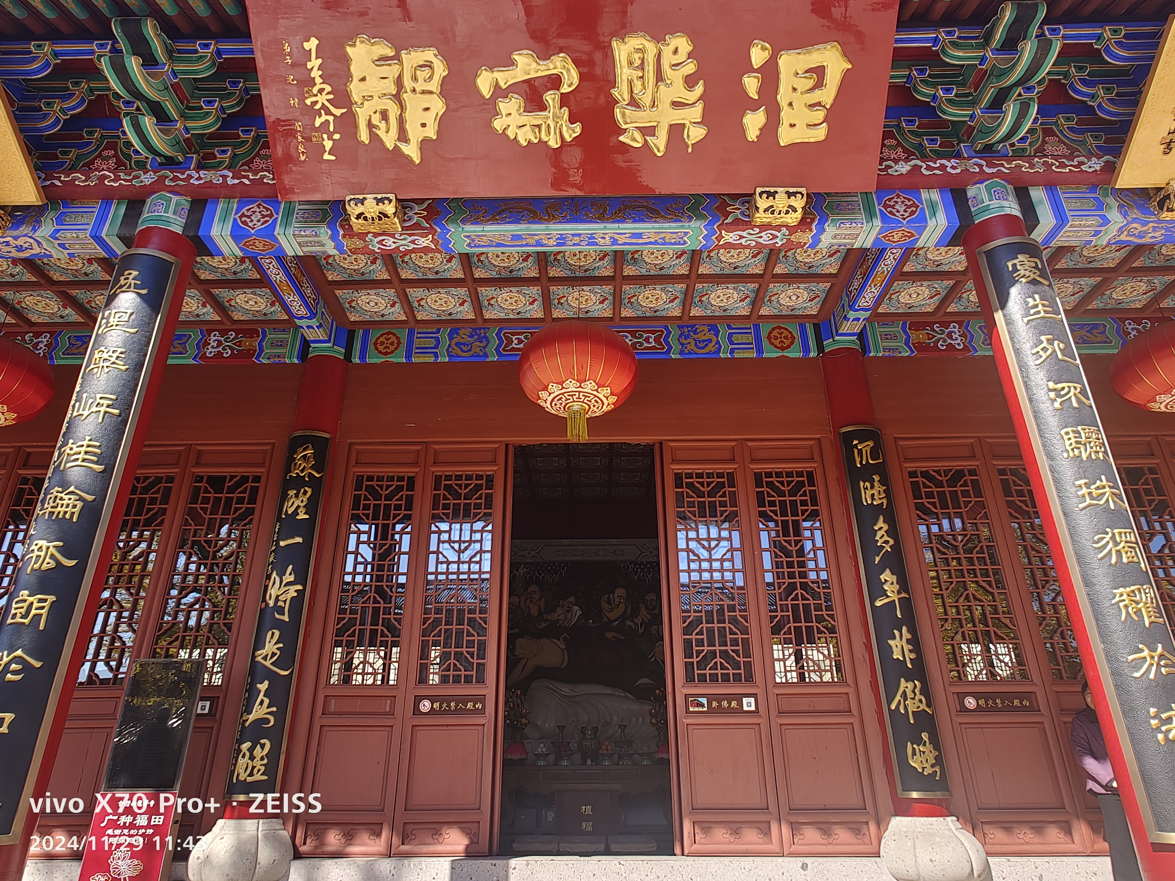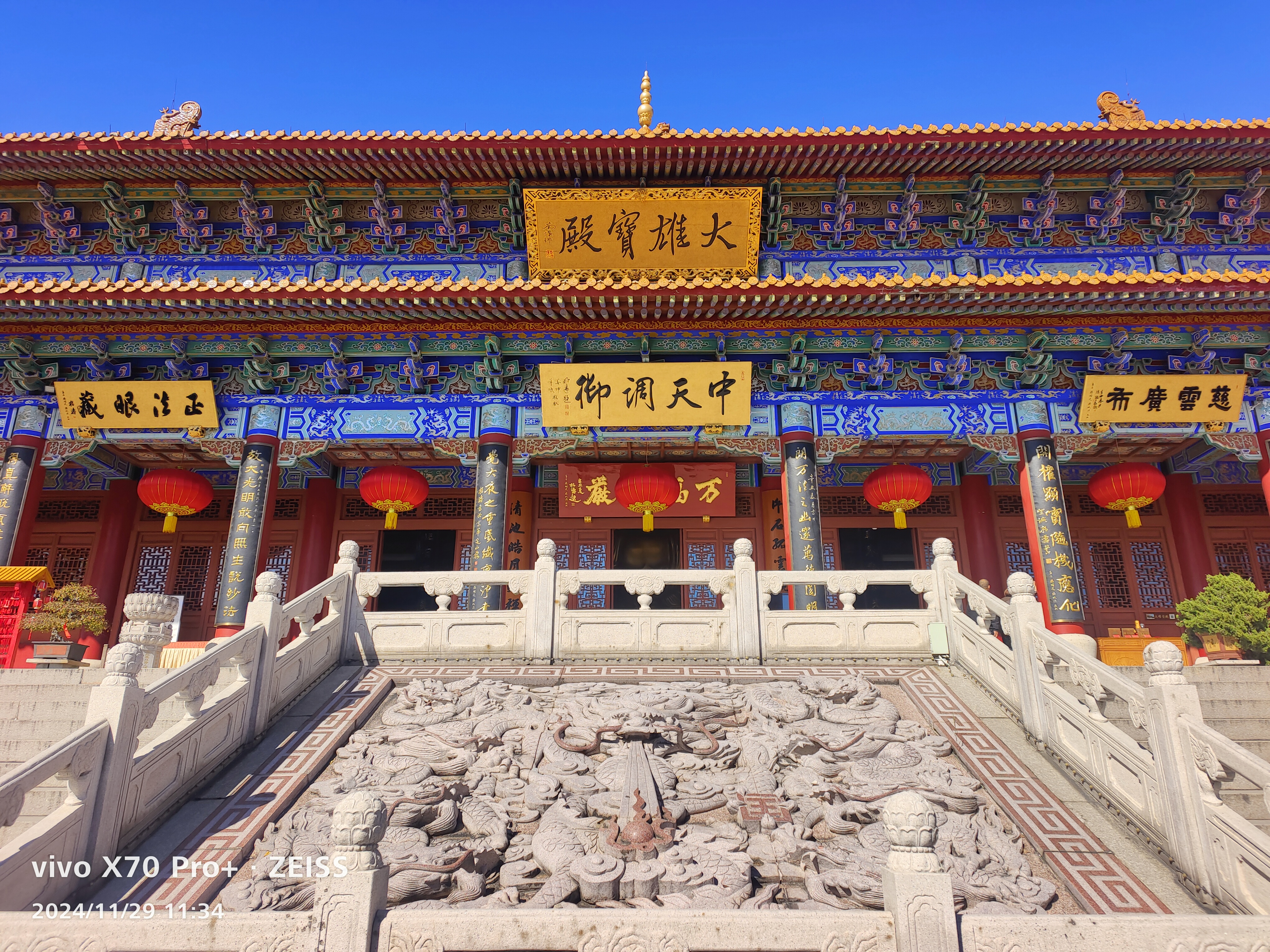 我们先到龙华寺,会稽山龙华寺建在香水海南,依山而建,将两个山头南北贯通,雕梁画栋,层层叠叠,清净庄严,气势恢宏;建筑面积达四万多平方米,是国内单体最大的皇家风格的佛教寺院。内有可同时容纳500人的禅堂及斋堂,有僧寮居士寮及上客堂等。龙华寺中轴线自北向南依次建龙华阁(内建藏经楼及法堂),供龙华树(桂花树)下弥勒成佛像及龙华三会场景露天雕像,左右建药师殿及弥陀殿,形成新的横三世佛殿;卧佛殿(内供汉白玉雕卧佛及十六住世大阿罗汉像);大雄宝殿(内供释迦佛及十大弟子及海岛观音群雕,东西配殿供四大菩萨及祖师伽蓝像);天王殿(内供接引布袋和尚像及韦陀坐姿像和四大天王像);山门(两侧供六米高石雕哼哈二将像);礼佛广场(宽56米长130米);水景照山。从照山到兜率天宫北侧北方多闻天王,形成了长达2500米的中轴线,堪称全国乃至世界之最。建筑风格融合了皇家寺院的大气恢宏和江南园林的婉约灵动,红墙、金瓦组成的礼佛殿堂群与富有江南民居风格的白墙、木柱、黛瓦组成的人居楼阁群相映成趣,移步换景,美轮美奂,彰显了二十一世纪皇家寺院的建筑典范。