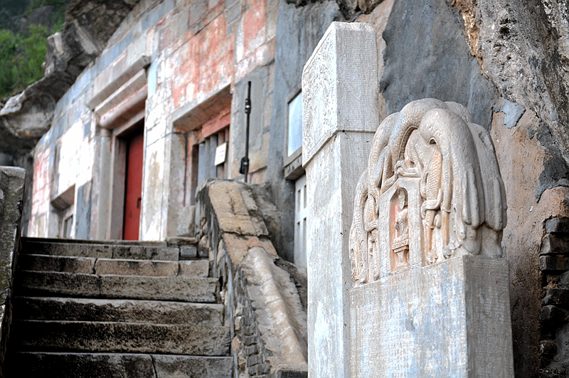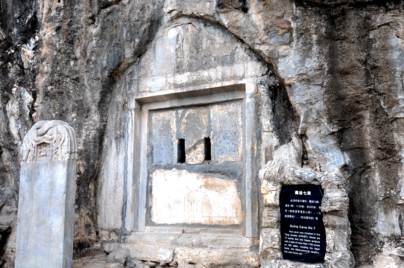 其实,山腰分两层,共凿有九个藏经洞,雷音洞是其中之一。雷音洞为开放式,洞内宽广如殿,四壁镶嵌经版都是静琬早期所刻,其实是一座石构造佛殿,是中国最早的人工构筑石质佛殿,年代可追溯至隋代。在中国古建筑以木结构为主的背景下,这座石质建筑的佛殿非常罕见。