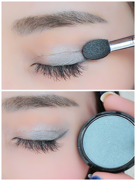 白色打底后,直接涂抹蓝色眼影在眼窝的部位