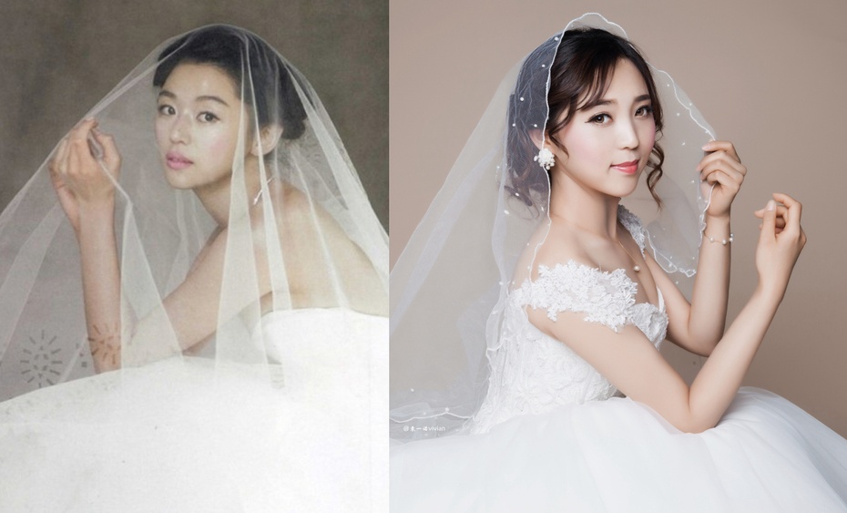 整体上有一些相似,都是婚纱照嘛。她属于气质型,照片拍出来后自己检讨了一下,但整体上还是很满意。全智贤的婚纱造型属于几年前的,我自己稍作了改良,希望大家喜欢