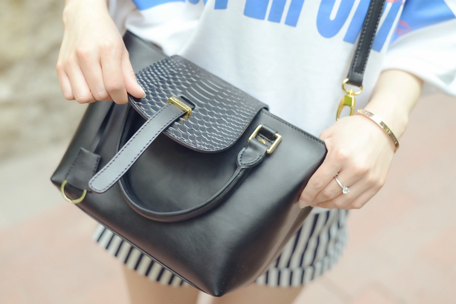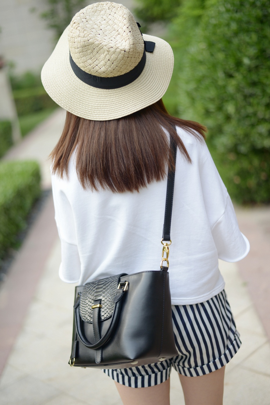 条纹短裤似乎是ZARA,我个人是条纹控,看到就想买,所以很少会留意是哪个品牌了,重点是自己败了一款黑色包回来,真是大爱哩!