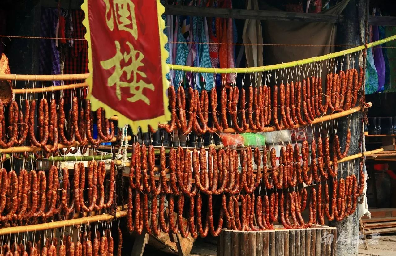 腊肠都是当地居民手工制作,香肠灌好后就挂在自家房前的河边,这里通风,可以很快吹干水份,便于保存。一到了腊月里,一串串腊肠挂在门前,自然就成为一道独特的风景了。