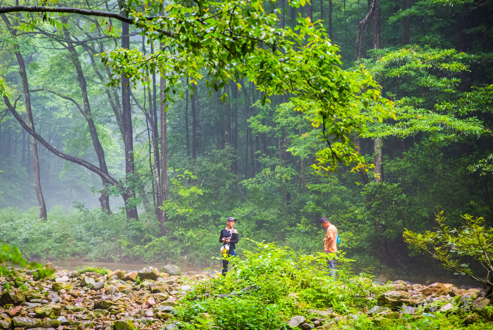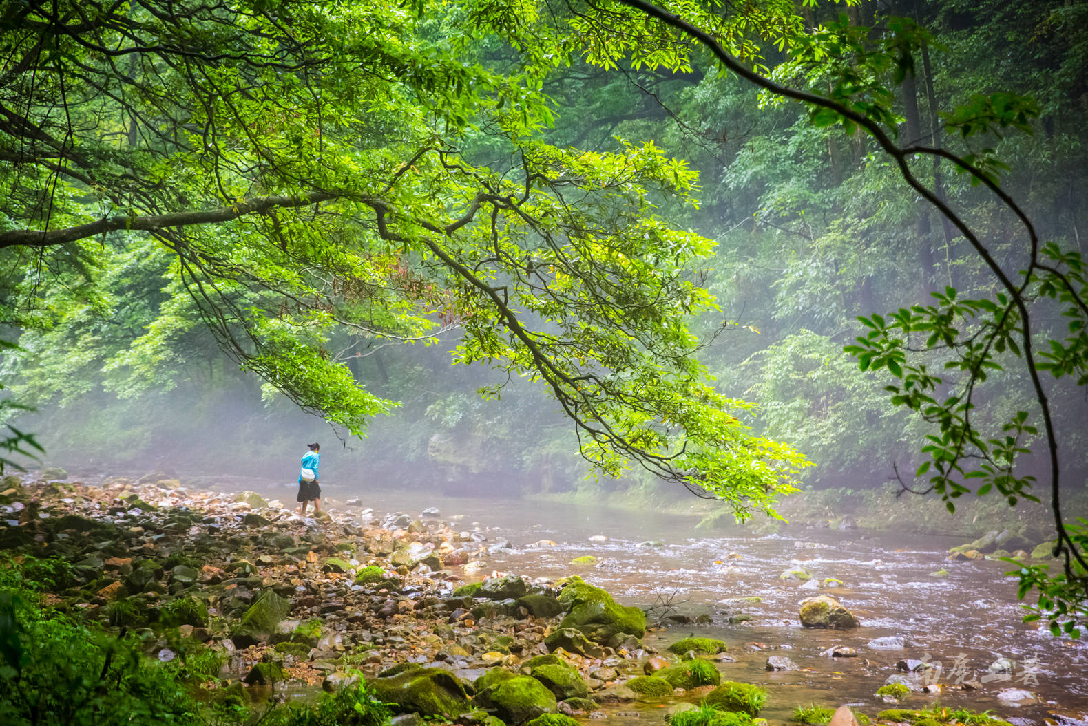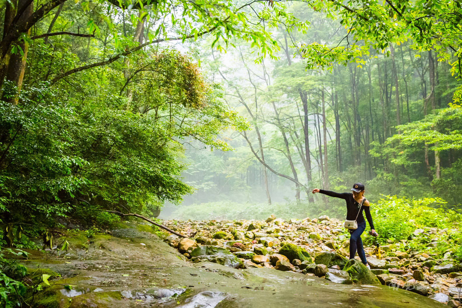 雨中的金鞭溪峡谷起一层薄薄的雾,幽绿的溪水更赋诗意,如一幅水墨国画。夏季这里的气温与山外相差10来度,是夏季最清凉的一条徒步线路之一了。