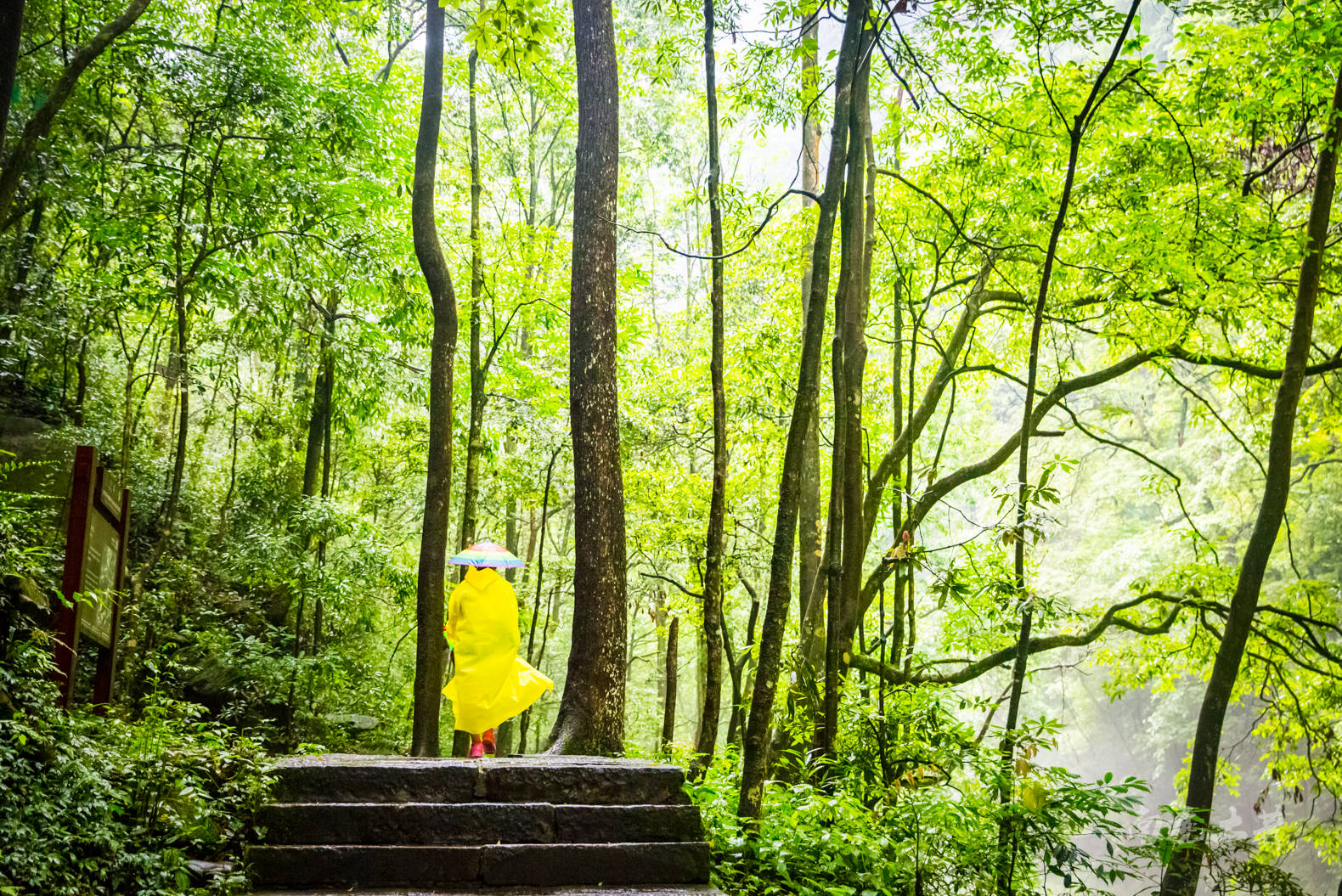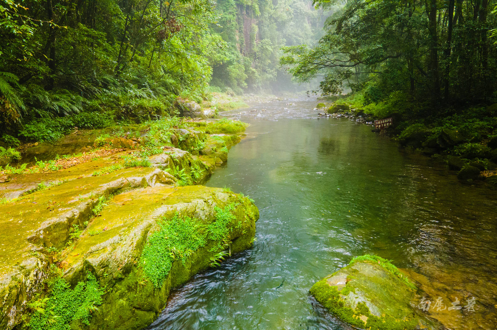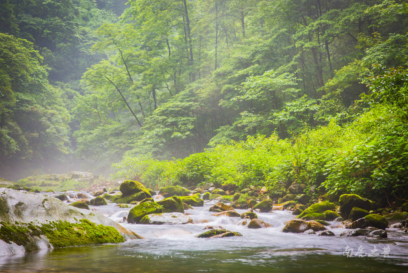 雨中的金鞭溪峡谷起一层薄薄的雾,幽绿的溪水更赋诗意,如一幅水墨国画。夏季这里的气温与山外相差10来度,是夏季最清凉的一条徒步线路之一了。