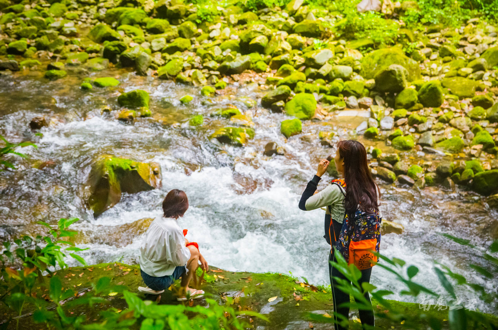 溪畔花草鲜美,鸟鸣莺啼,浅浅石滩,也是女孩子们最喜欢的嬉戏地。