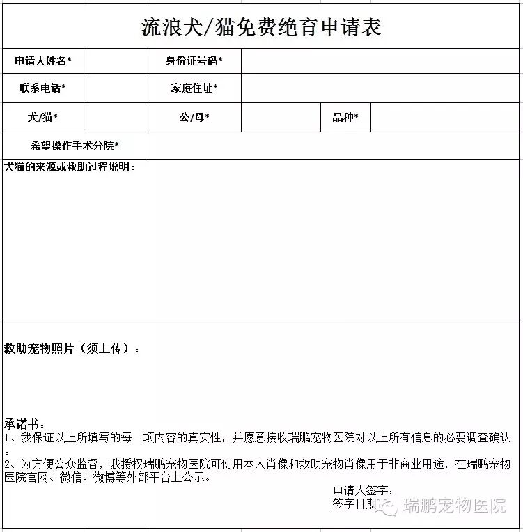 3.为了整个免费绝育公平公正的进行,申请人需实名制,同时需对进行绝育的每只宠物拍照存证,在瑞鹏宠物医院官网、微信、微博等外部平台上公示,以方便接受公众监督;