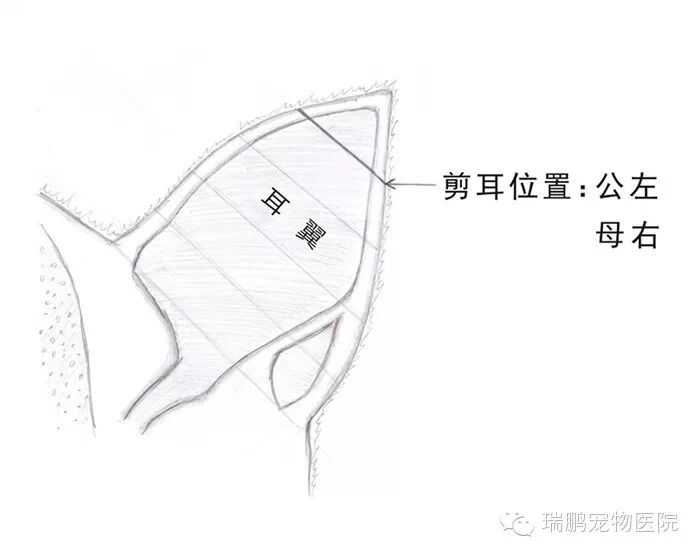 在猫耳朵上按男左女右将猫耳朵顶端平剪约1/3耳廓位置。剪耳径深最多不超过1CM,正确的剪耳方式参考下图所示: