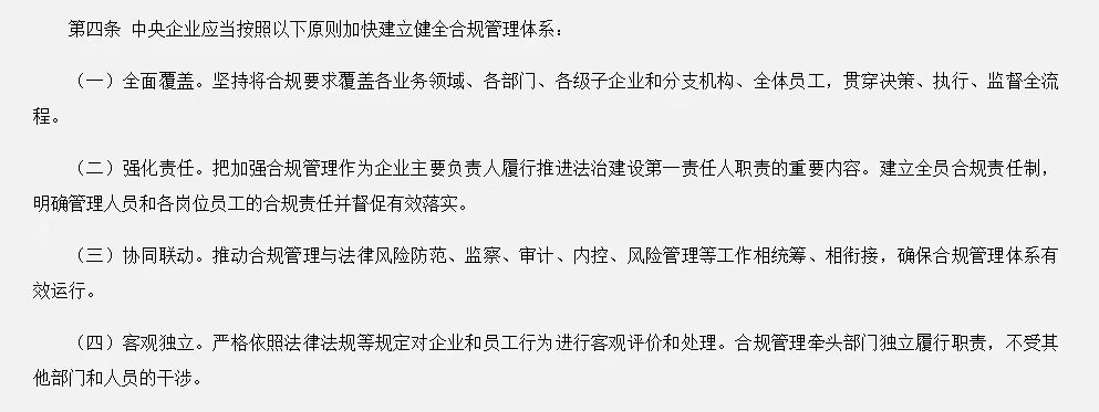 国资委《 关于印发《中央企业合规管理指引(试行)》的通知》中要求组织建立健全“全面覆盖、强化责任、协同联动、客观独立”的合规管理体系。