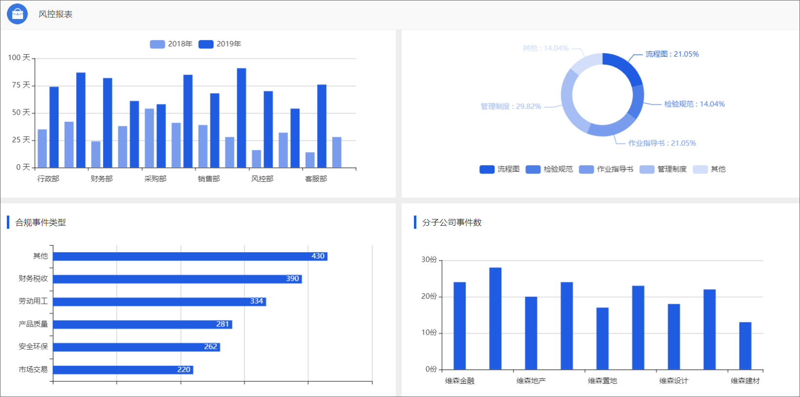合规管理成果的全面展现,从类型、时间、分子公司、部门多个维度的分析,支持自定义各种图表进行展现,便于相关决策分析需要。