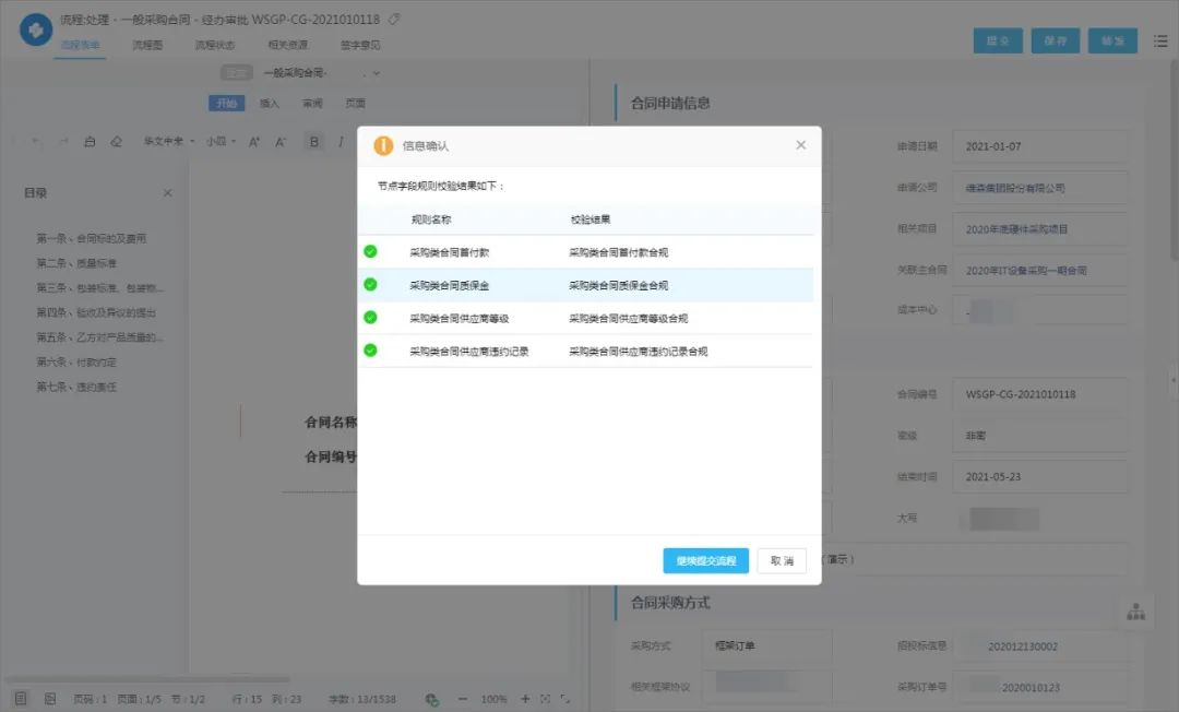 支持根据既定业务规则对合同付款事项进行自动合规检测,同时可依据预算数据与资金计划对合同付款进行管控。