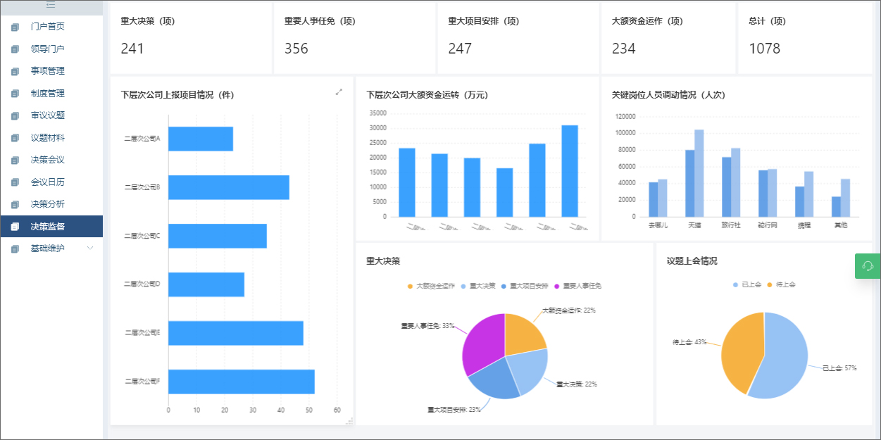 提供决策制度数量统计、事项清单数量统计、决策会议折线图统计、决策议题柱状图统计、异常情况数目统计等。