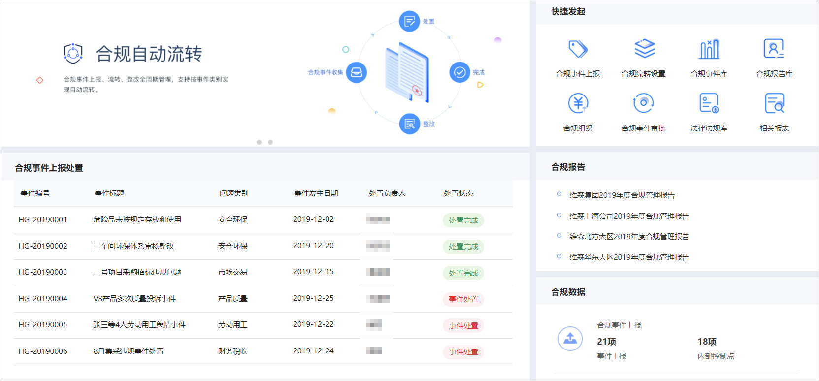 合规管理的核心,主要是专项合规事件上报,自动流转至相关责任部门进行快速处置,形成上报、处置、整改、监控全周期闭环管理。