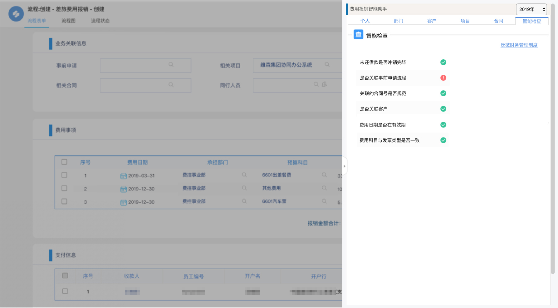 财务合规:智能合规检查可辅助用户在报销审批时,根据各项合规指标自动进行合规检查,识别潜在风险,辅助决策审批.