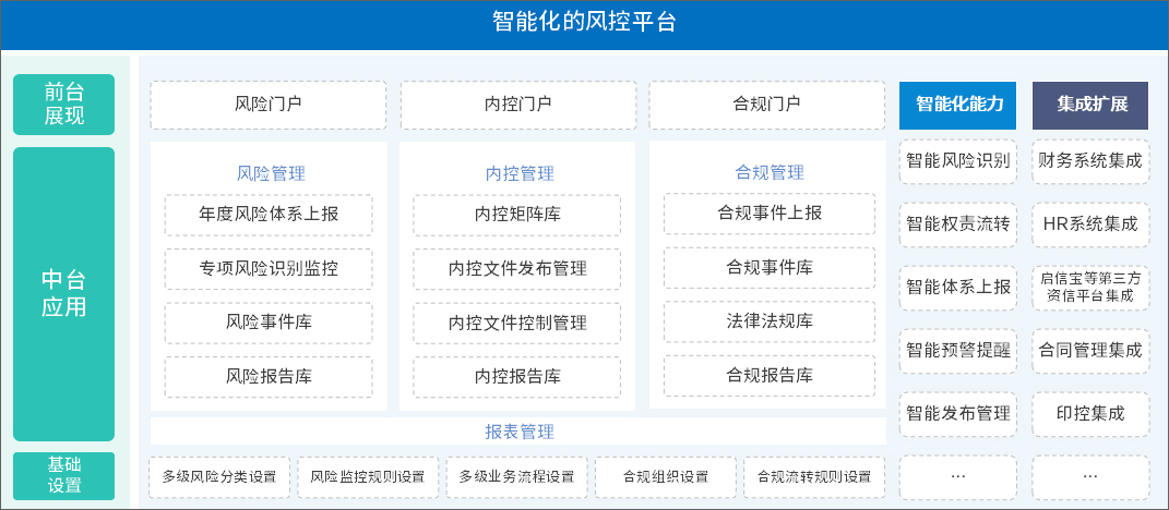 泛微风控管理应用的核心是助力企业建立统一的全面风险、内控、合规管理一体化平台,实现风控管理体系在系统中的落地,通过不同视角,将风控体系相关信息、数据、应用进行智能聚合展现,并且融入法务、案件、诉讼管理等功能,根据组织实际,可分可合,按权限使用,一体化管理。