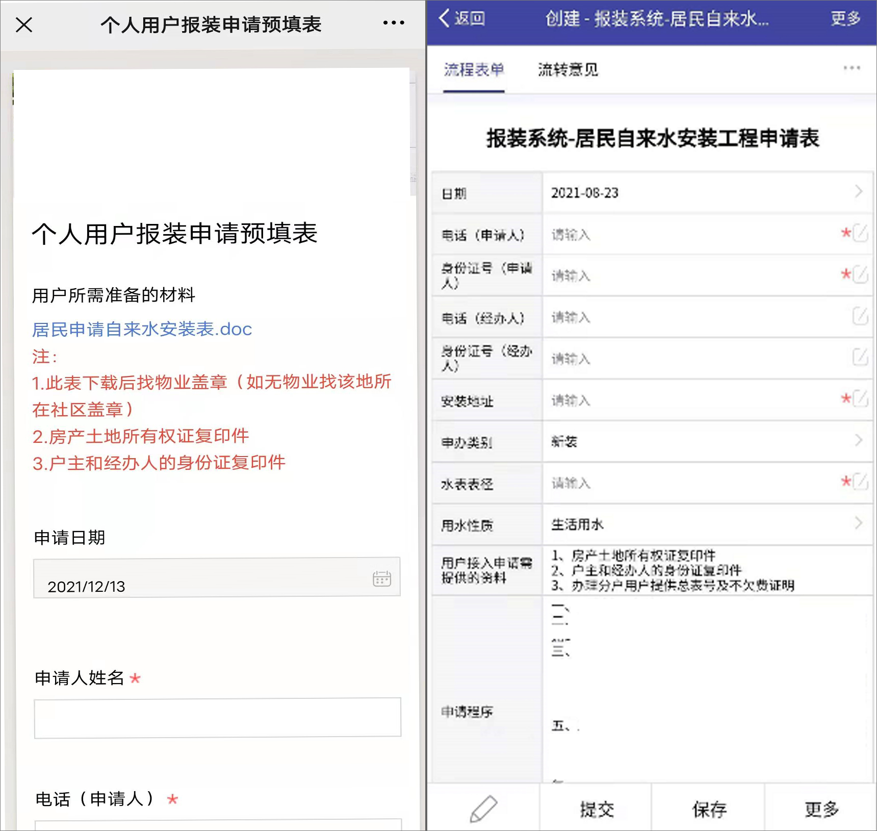 1、自来水安装工程申请: