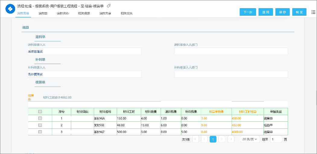 跟进项目施工实际情况,结算时系统自动根据材料单、补料单、补料单等相关单据,生成核算单据,确认后完成结算。