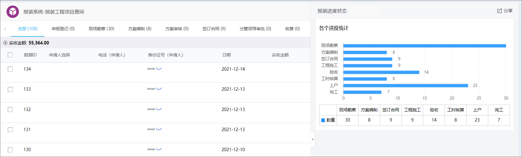 通过建立报装工程台帐,实时反馈当前每项工程的进展情况、不同进度节点有多少工程,实时统计业务数据信息。