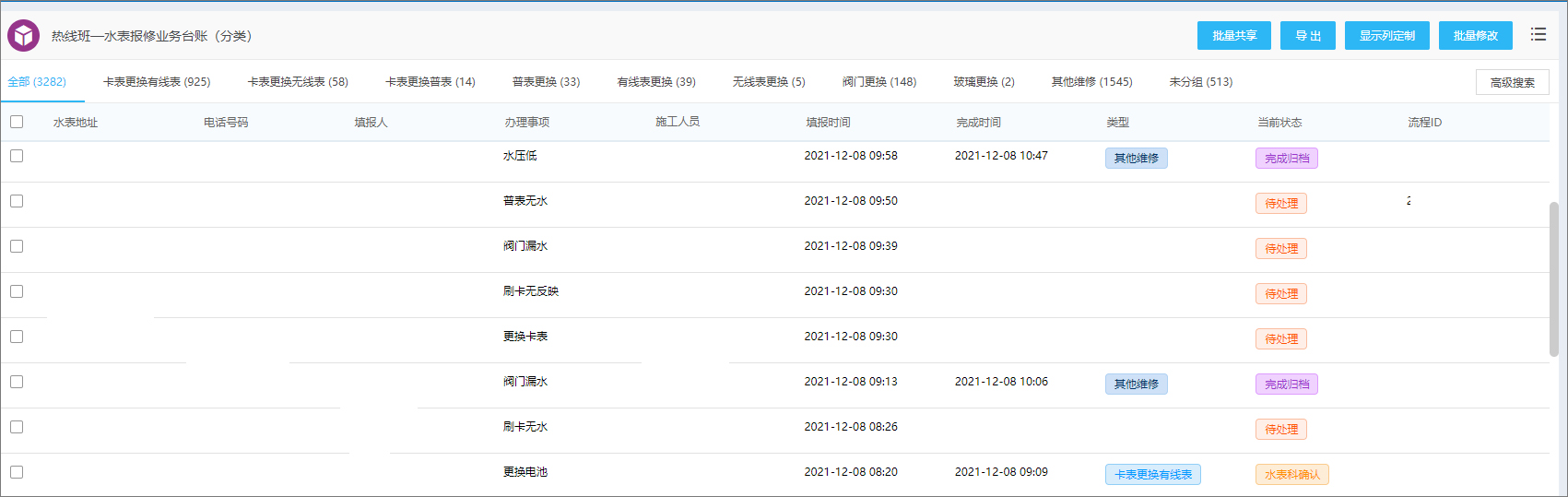 相关人员可以在线登记报修信息,流程自动推送到相关项目施工人员,进行下一步的现场勘察,并形成水表报修登记台账。