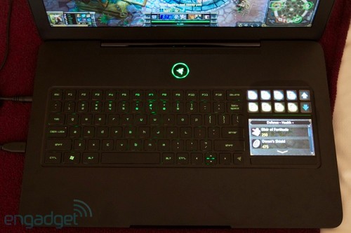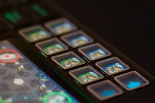 触摸板和十颗按键跑的是定制化的 Switchblade UI,其发想来自于 CES 上展出过的Switchblade概念笔记本电脑(配置了英特尔Atom处理器,号称能够流畅运行魔兽世界)。触摸板放置在右侧的方式可以说比较特别,但是谁能说这样的设计不适合笔记本呢?