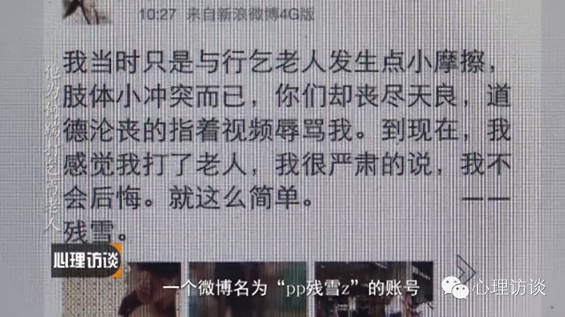 一个网名叫“残雪”的人说他就是视频中的打人者,他对自己的行为不但毫无反省,反而指责网友“丧尽天良”、“道德沦丧”,为了证明身份,他不但发布了自己的照片,还把事发时穿的衣服照片也发布了出来。