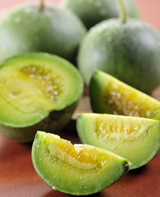 唐山土壤肥沃、昼夜温差大,种植经验丰富,生产周期长,造就出了优质的脆宝香瓜。单果重约≥200g,果型端正。