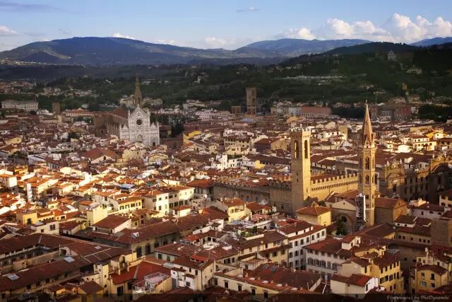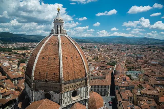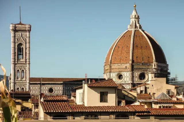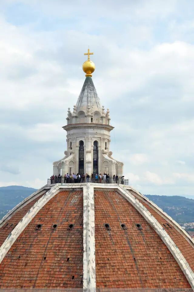 登上414级台阶到达钟楼顶部,远眺佛罗伦萨这个砖红色的中世纪城市,仿佛定格在时空之中,忘却了时间的脚步。这里几百年都不曾有过改变,它格局分明,尤其是靠近城中心的大教堂区,更是横平竖直,排列有序。