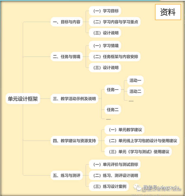 “大单元教学设计”是指以大主题或大任务为中心,对学习内容进行分析、整合、重组和开发,形成具有明确的主题(或专题、话题、大问题)、目标、任务、情境、活动、评价等要素的一个结构化的具有多种课型的统筹规划和科学设计。而实践研究则是教师将“大单元教学设计”在课堂上落地实施与呈现的过程。大单元教学设计是一个系统,包含了目标、情境、任务、活动、资源、评价等诸多要素,是一个完整的学习方案。(如下图资料引用)
