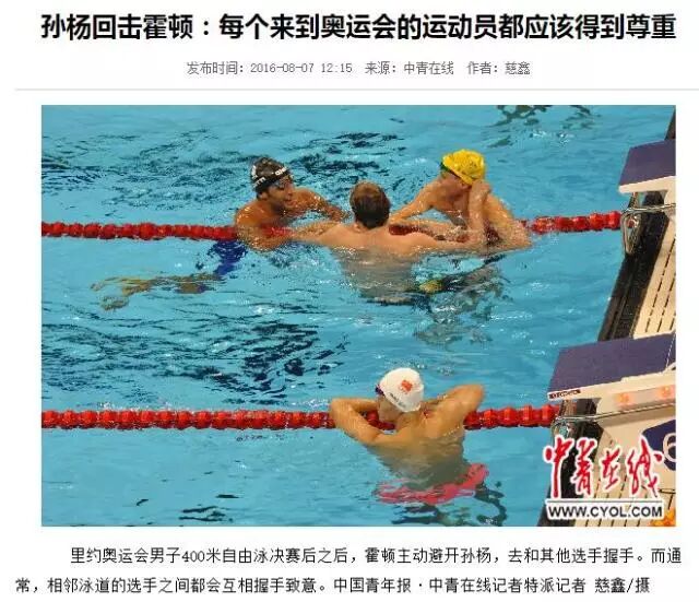 而且那些澳大利亚媒体也在故意挑事,把孙杨之前在泳池中拍水和霍顿打招呼的事情,污蔑成是孙杨在拍水干扰霍顿练习。结果,就连霍顿自己都承认媒体夸大了事实。