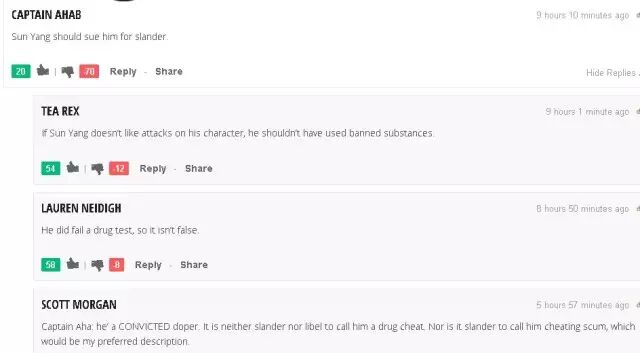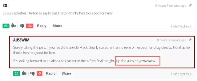 不过,这也其实并不奇怪,因为在知名的泳坛网站Swinswam.com上,已经有一群来自澳大利亚泳坛的人士在持续不断的侮辱孙杨了,比如下面这位: