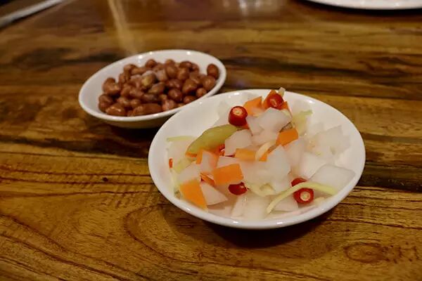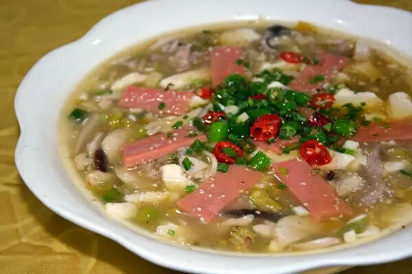 豆花鱼是最爱的一道菜,红红的汤汁看起来很是诱人,除辣椒花椒外还放了酸菜调味,鱼片滑爽细嫩,味道麻辣酸爽。听老板说,店里所需的腊肉、辣椒、花椒等原料都是从四川运来,才保证了食物味道的浓郁纯正。