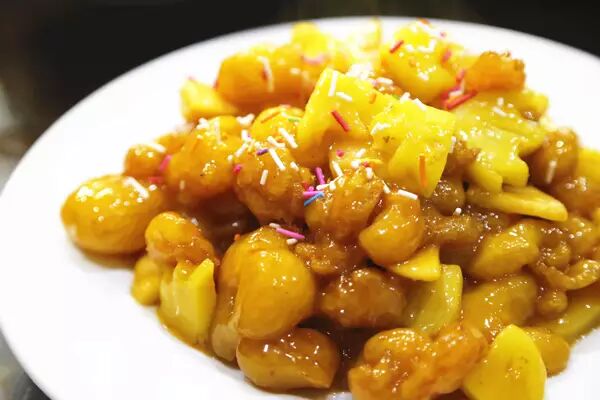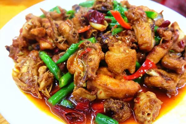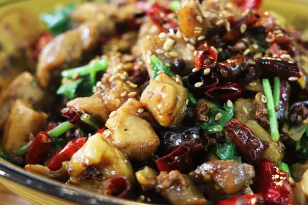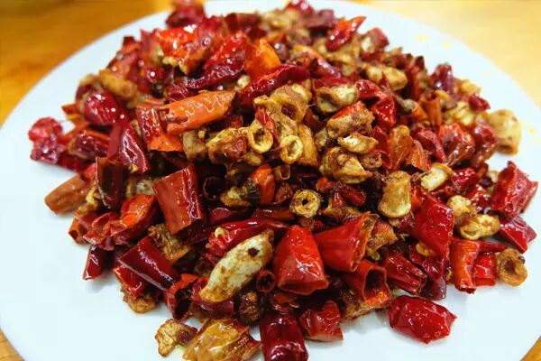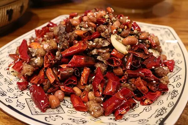 辣子鸡端上来便发现辣椒的用量十分足,卖相色泽鲜亮,味道咸鲜醇香,麻辣味偏浓,鸡块经过炸制后翻炒,味道鲜美。
