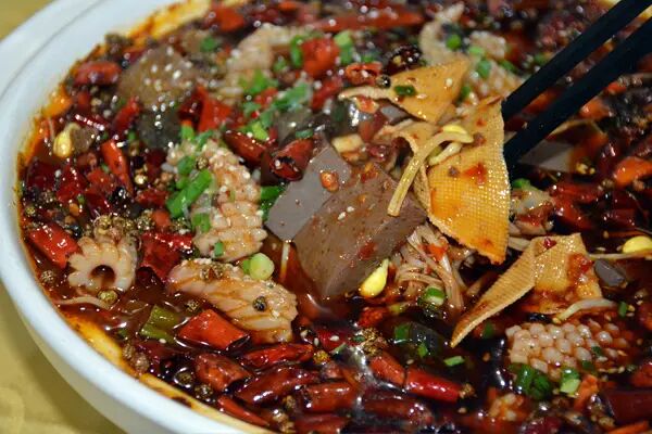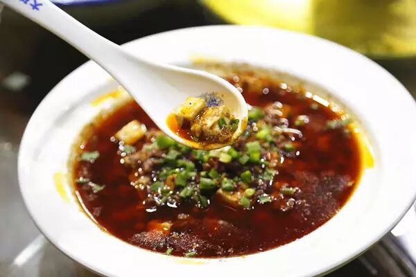 豆花肥肠是川菜系著名的一道小吃,汤汁浓郁,色泽鲜艳,放入大量辣椒、花椒调味,卖相喜人。我本来是不爱吃这种内脏的,可这道豆花肥肠口味却是颇合我心意。肥肠鲜香厚重,质感香醇,跟想象中那般肥腻一点都不同。豆花滑嫩,辣而不燥,份量也比较足。