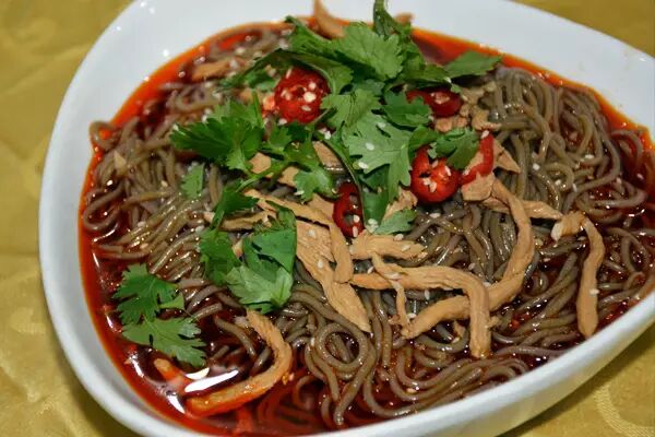 黑黢黢的鸡丝荞面看着不讨人喜欢,但一口就让你吃到有别与他家的味道,荞面自然好嚼,每一根细细的面条上都微微吸附了酸辣的汤汁,瞬间打开你贪婪的味蕾。