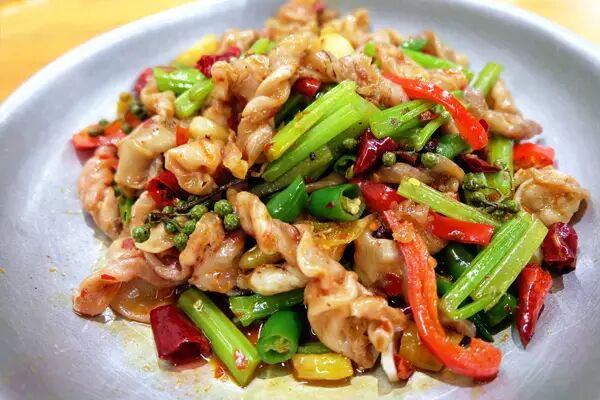 菜一上桌,四川辣椒特有的香气便迅速侵占鼻腔,无法抵挡的香味战胜了对食材的怯意。被切成小拇指肚大小的脆肠带着花椒的鲜、辣椒的香,丝毫没有任何奇怪的味道,香脆弹牙,韧性十足。既没有大肠的油腻,又比鸭肠更筋道有嚼劲,简直是不能更棒的口感新体验。
