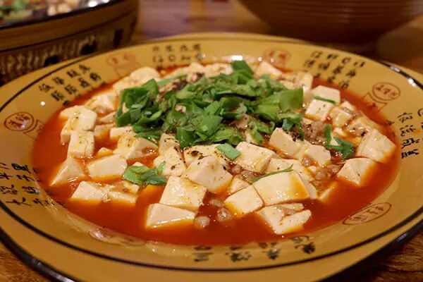 麻婆豆腐也是一道经典川系名菜,色泽红发亮,一厘米见方的豆腐小块淋上肉末,上面盖以葱花,红白绿相衬。豆腐块渗入麻味辣味,而本身嫩滑味甘平,搭配起来甚是美味。