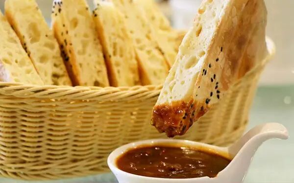 信阳特色的地锅馍,外皮焦香酥脆,咬至里处香软味甜,就着酱料又变成另一种美味,酱料中看得出有颗颗粒粒的黄豆酱,酱料并不咸味十足,咸度适宜开胃至极。