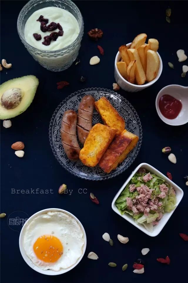 主食:香肠、蛋焦面包、自制薯条