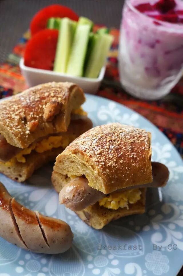 主食:南瓜面包夹炒蛋&德式香肠