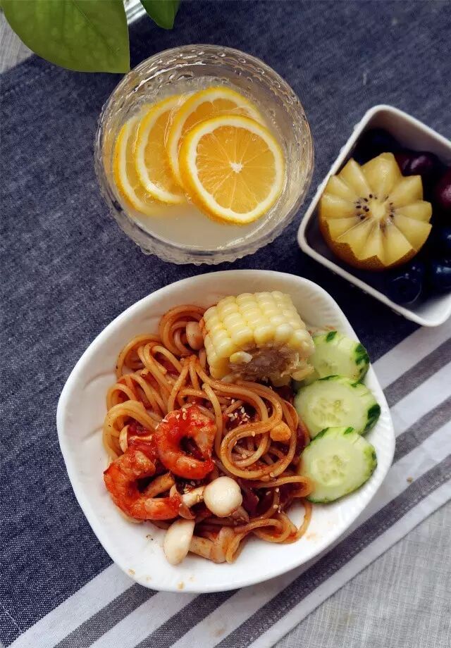 主食:鲜虾意大利面、玉米
