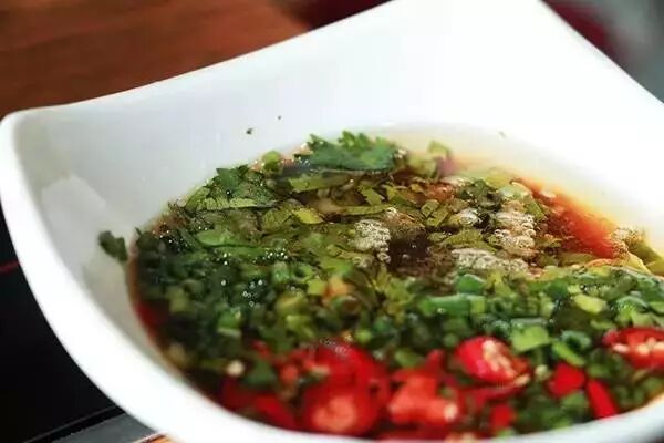 店内秘制的小料也极有特色,红椒酱打底,橄榄油上撒满的碎香葱、香菜和鲜红椒,色鲜味美。
