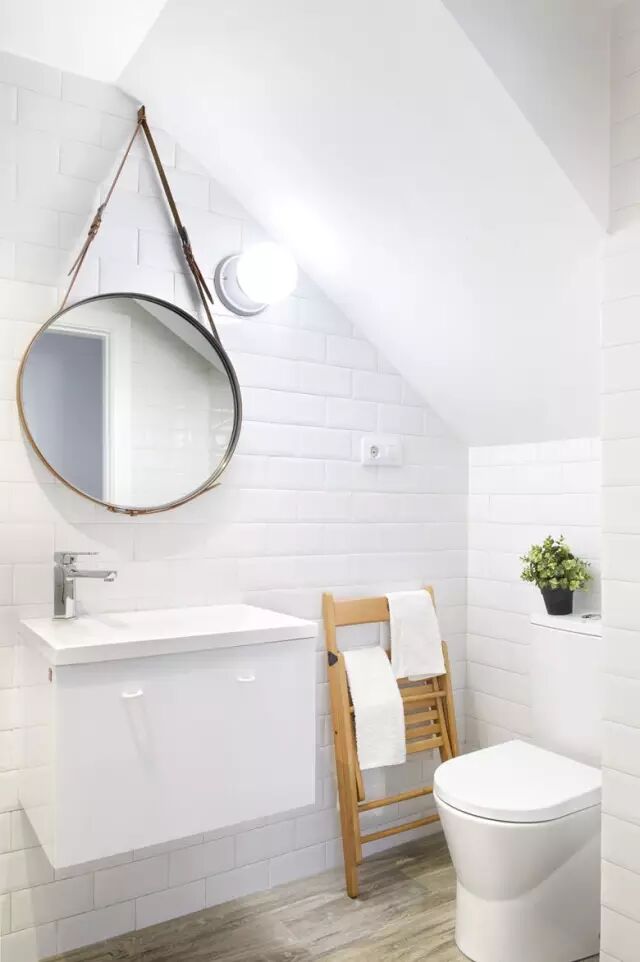 ▲浴室小而迷人,开放的淋浴用玻璃分区占用整个空间的一小部分,其余由马桶和水槽占据。以两种不同类型的地板,在视觉上定义了两个不同的区域,圆形的 Adnet的镜子挂于中心,增添质感,使得整个浴室更为优雅。