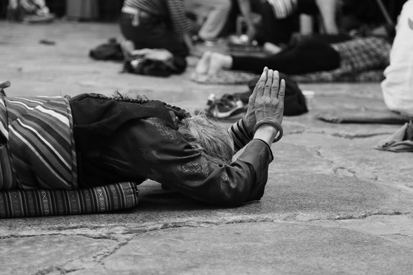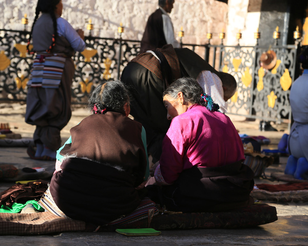 盘坐在大昭寺前晒着太阳,这是一个久违的习性。坐下,灵魂似是扎在了这里,文成公主的碑就在身后。一千三百年前的故事竟无多少人提起。来往的背包,各地的旅者,与我一般,席地而坐。往往,我心里是有困惑的。为何要坐下?为何要晒一次太阳?为何我曾是遇佛不拜,却在第一天来到大昭寺前就叩了108个等身长头?