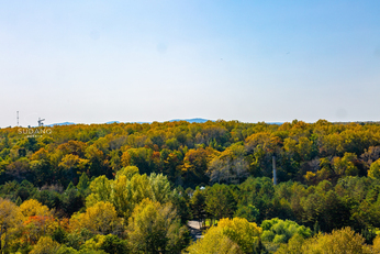 如果站在美人松空中廊桥上,你会发现这座小镇几乎是被森林所覆盖,远处的长白山隐约可见,周边还有一座类似欧洲风格的高耸尖塔穿出林海。