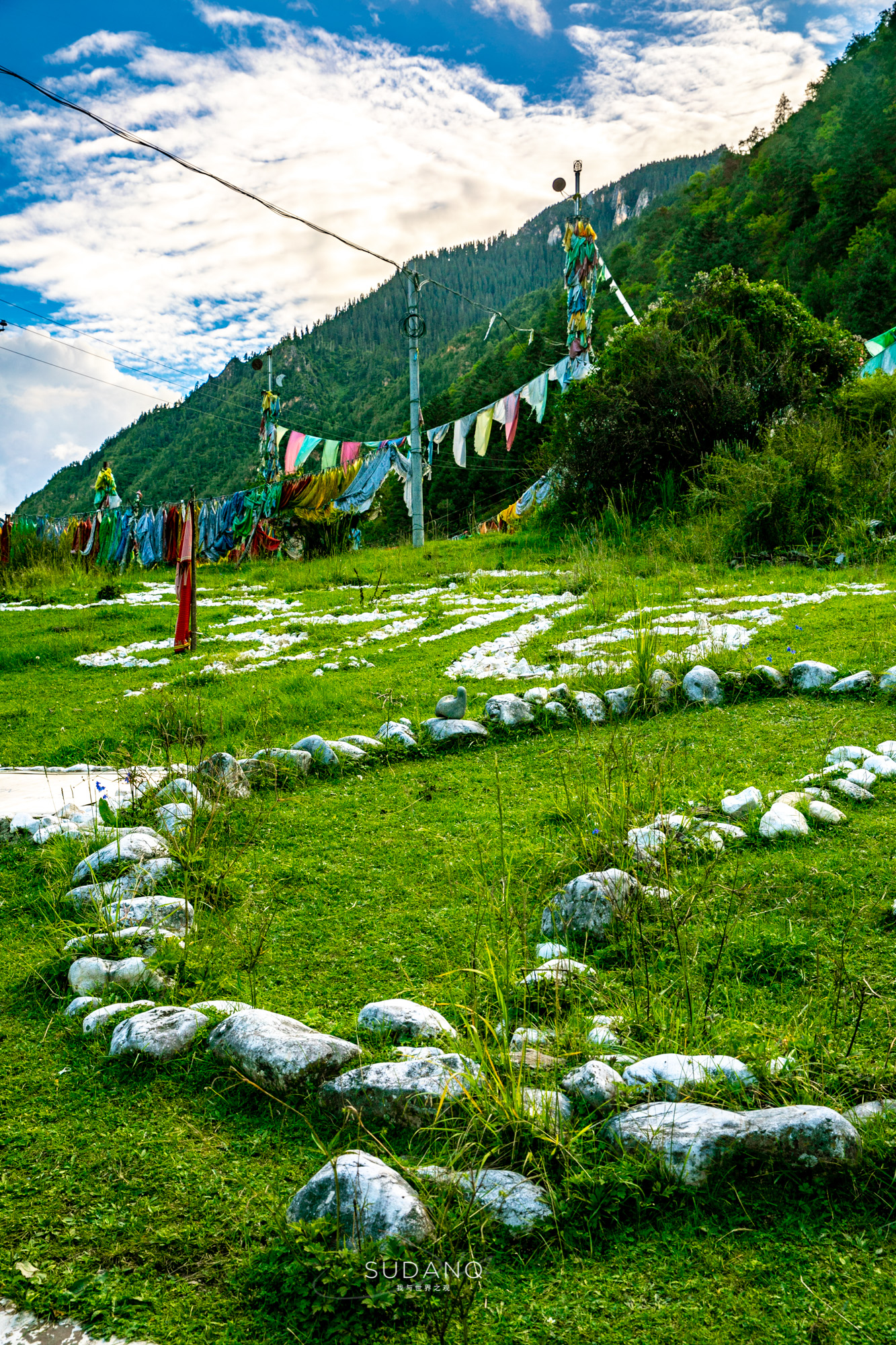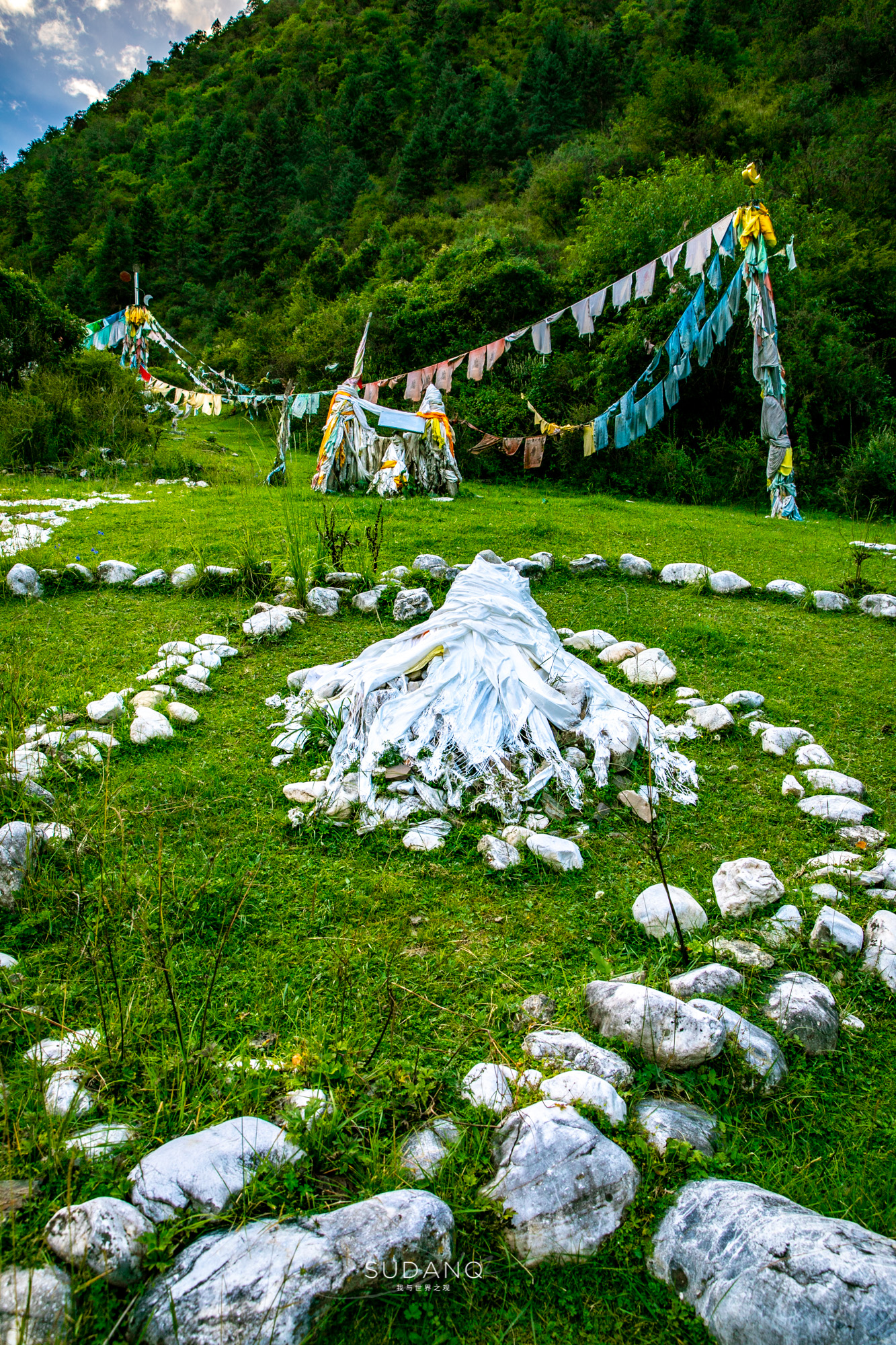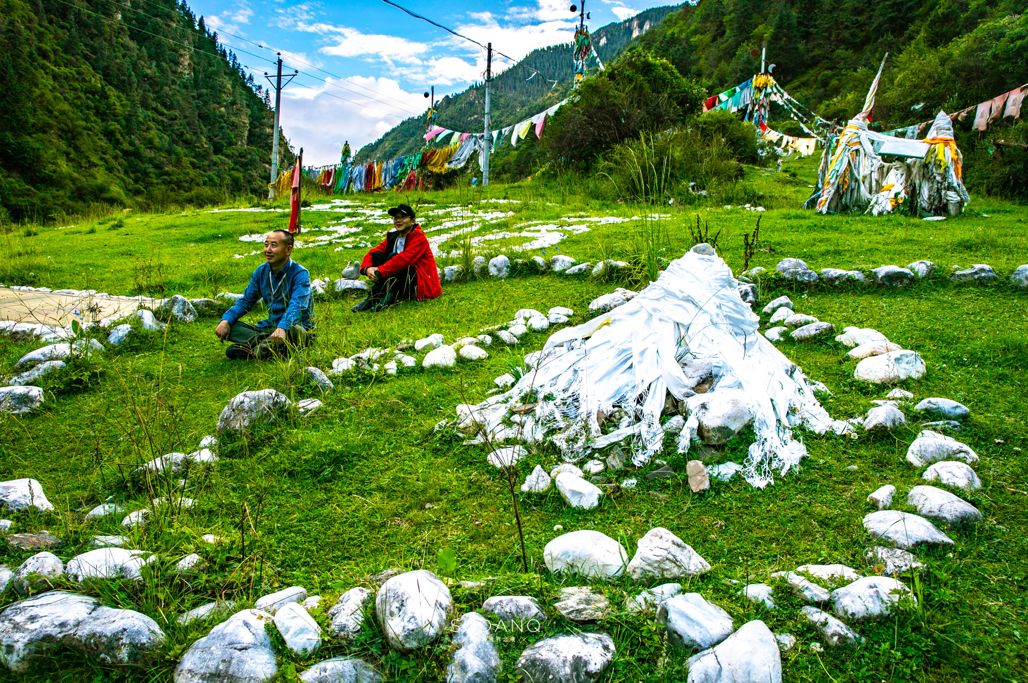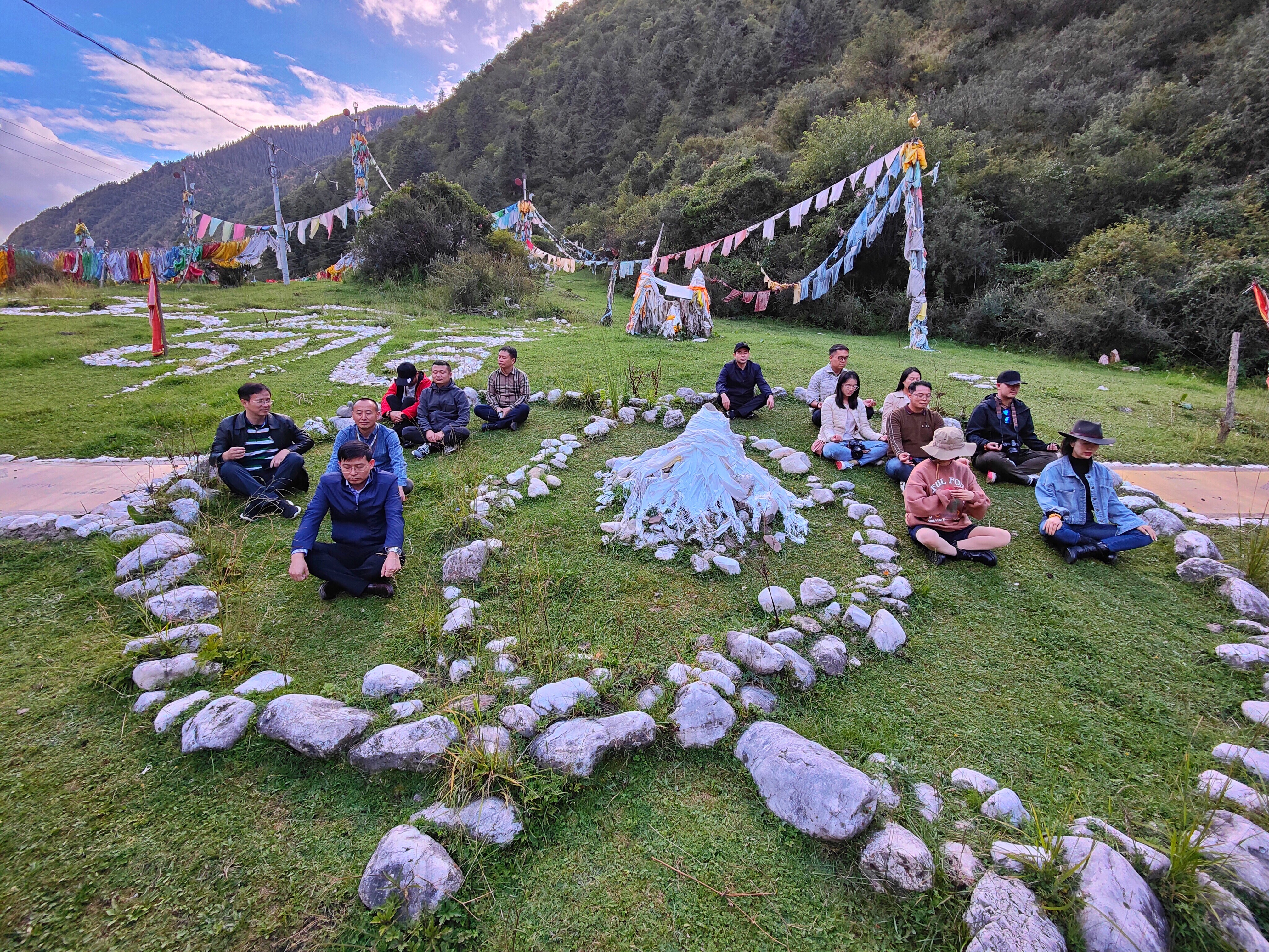 神圣西藏康复道场就坐落在317国道旁,由里、外用白色石块组成三个圆圈。附近经幡飘扬,洁白哈达覆盖在石堆上。