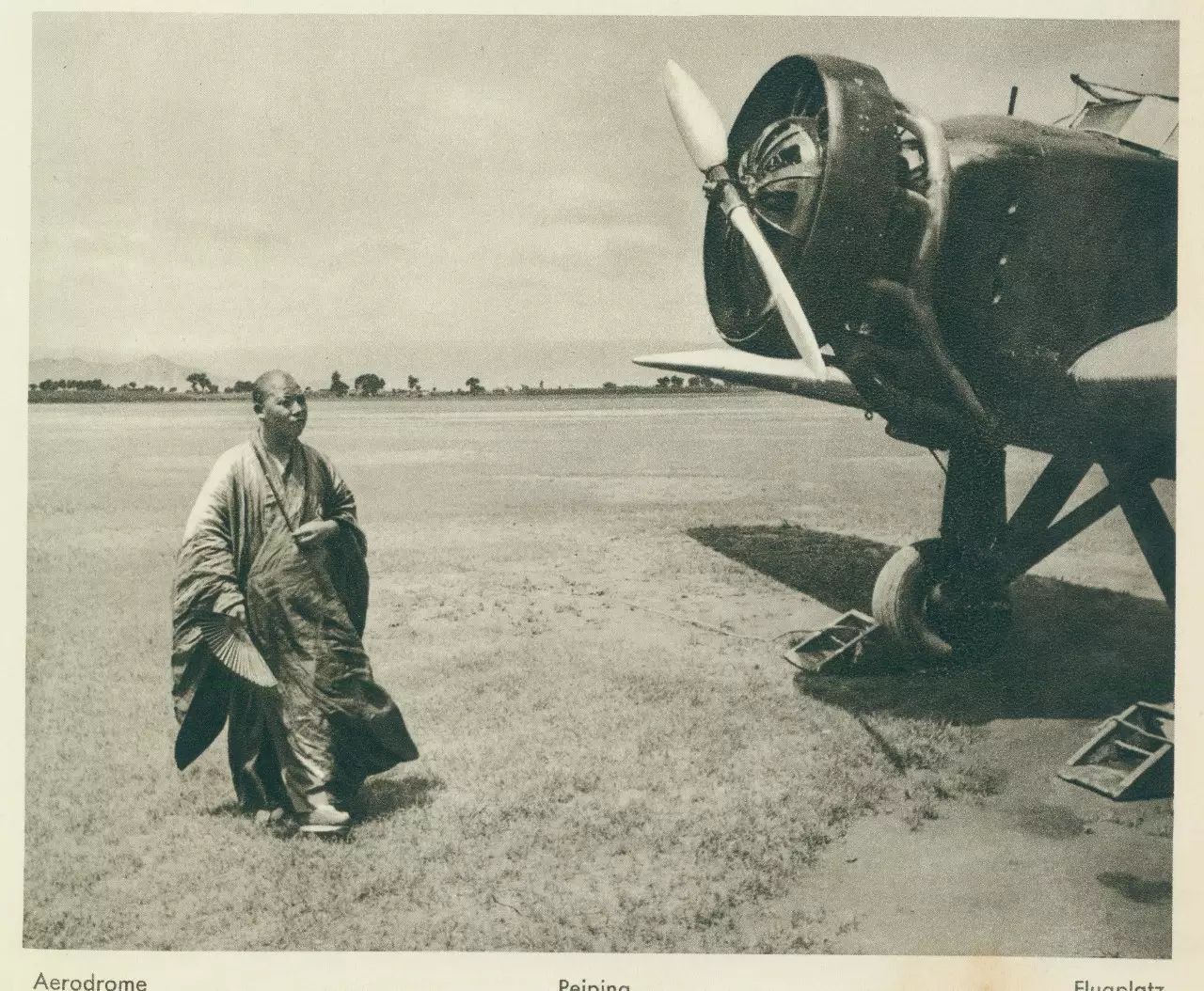 照片中一个戴着念珠、手持纸扇的僧人走过容克W34飞机前。