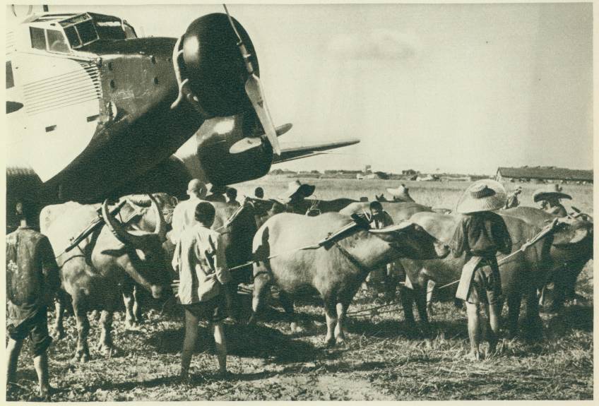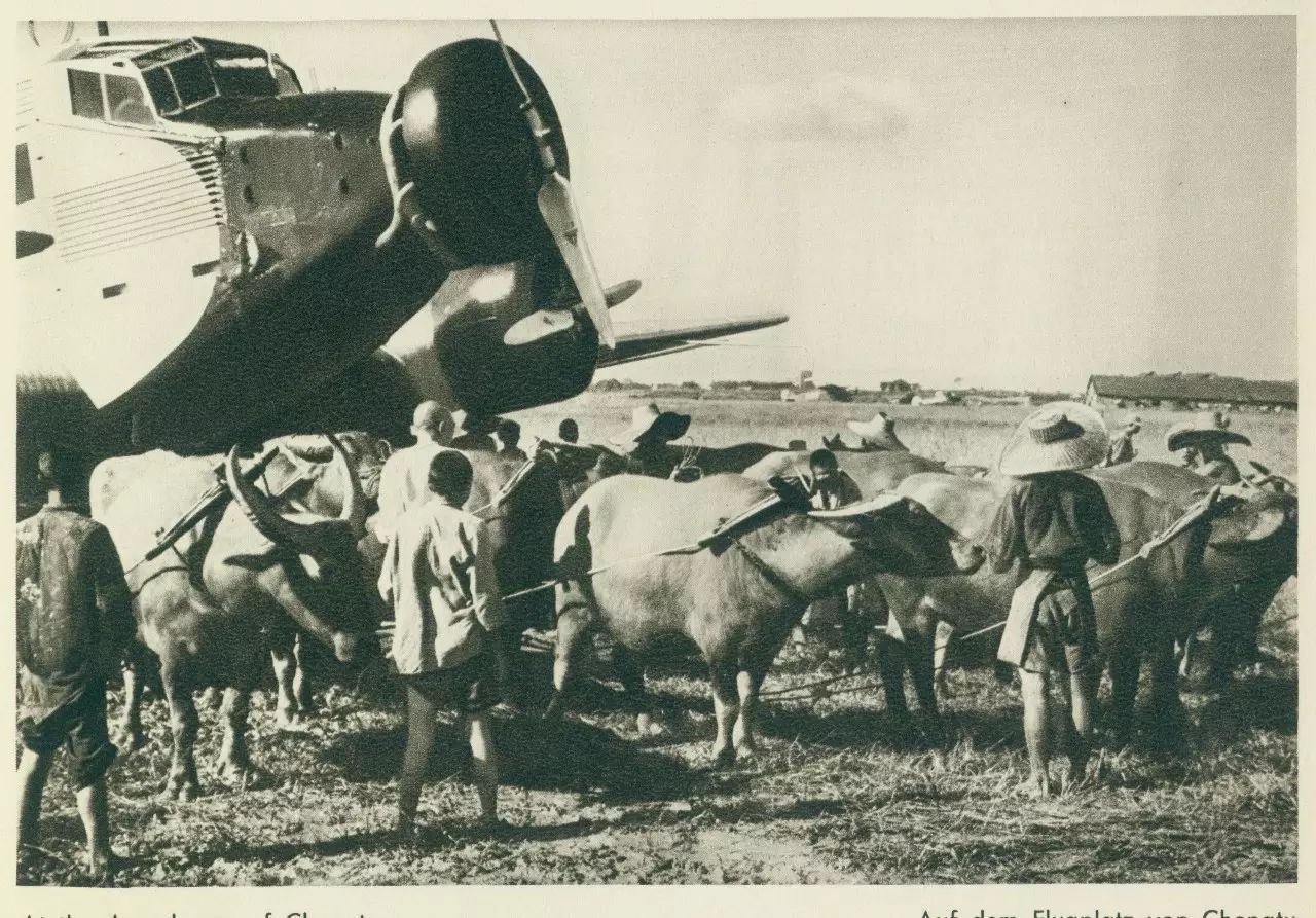 第一次驾驶容克Ju52飞机在成都降落,起落架就陷入了沼泽地里。起初,我们试图用水牛把飞机拉出沼泽地,不过没有成功。后来,我们不得不把机翼支起来,刨去飞机轮子周边的烂泥,把长条木板垫在轮子下。照片中可以搬运泥土的工具是当地常见的箢箕。