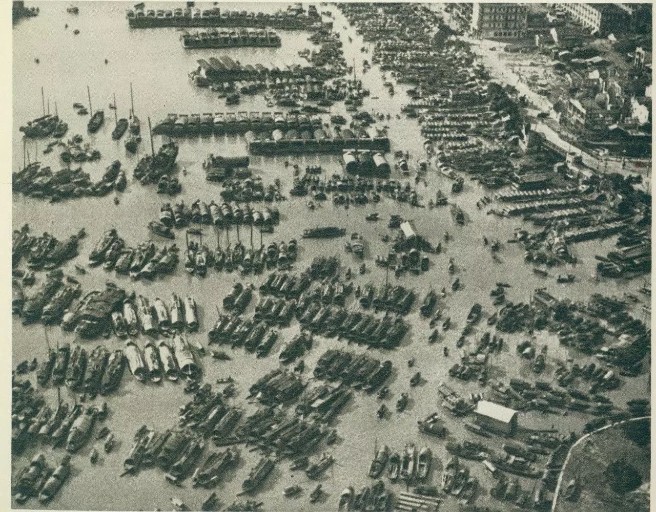 珠江上小船众多,常住人口有二三十万人。照片后部的大船是供交际娱乐的花船。