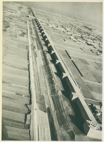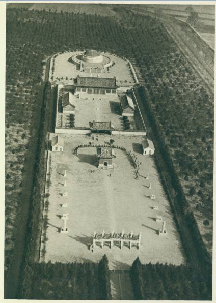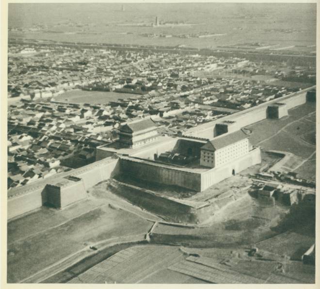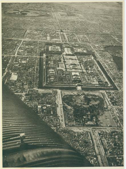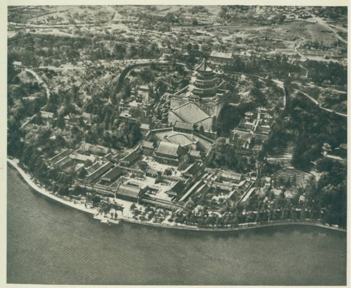 这座皇陵坐落在北平到汉口的铁路边上,修建于明朝。图中中门前可以看到列队操练的士兵。
